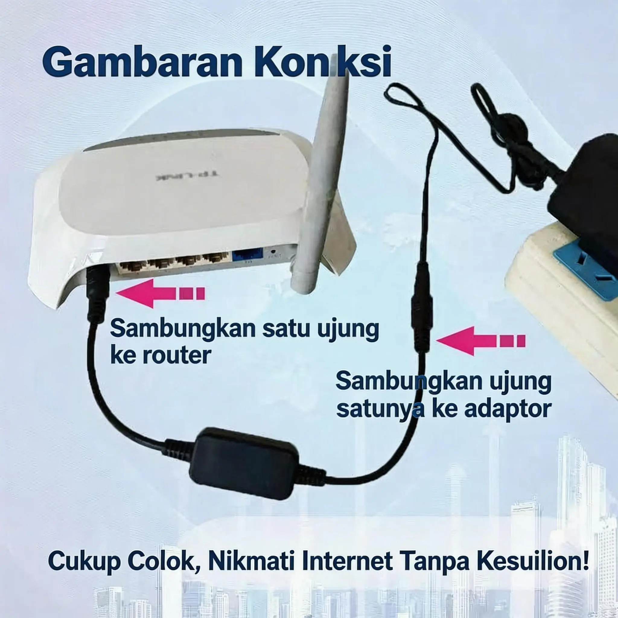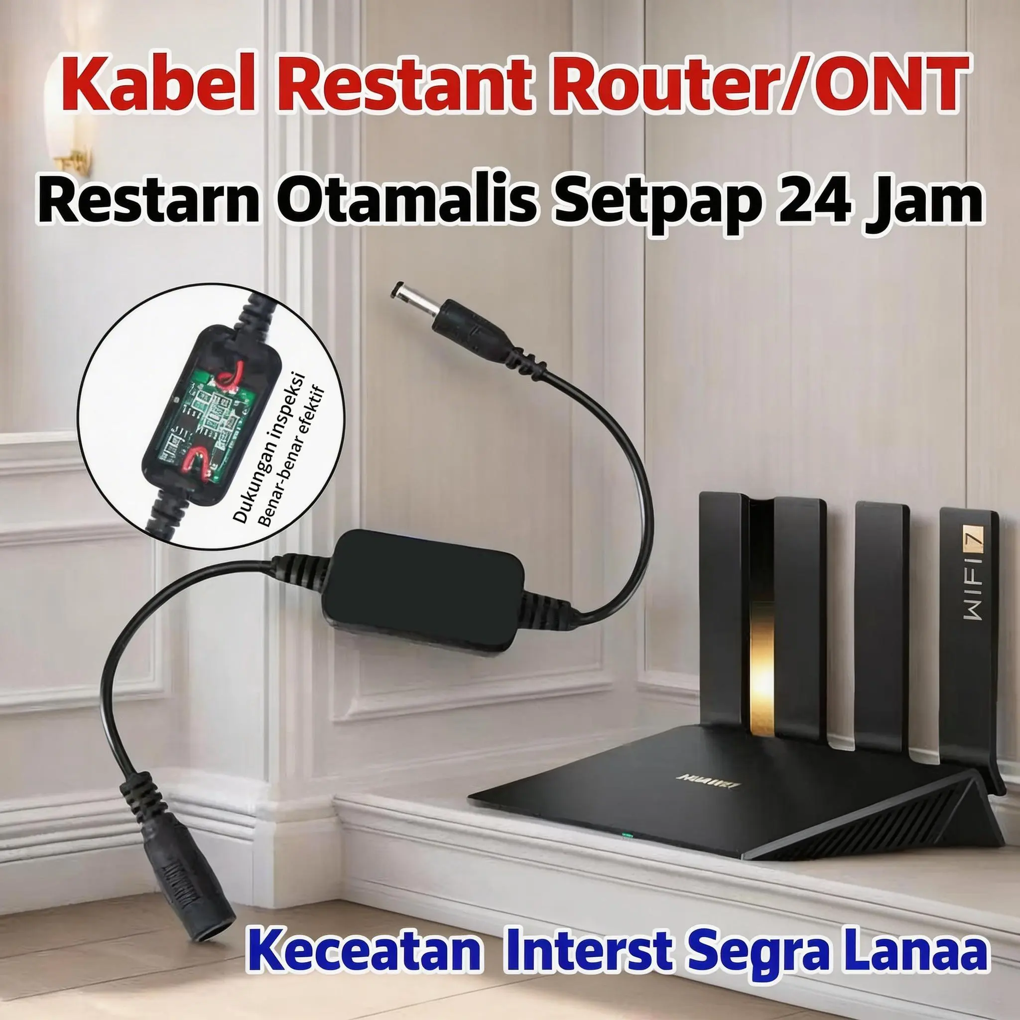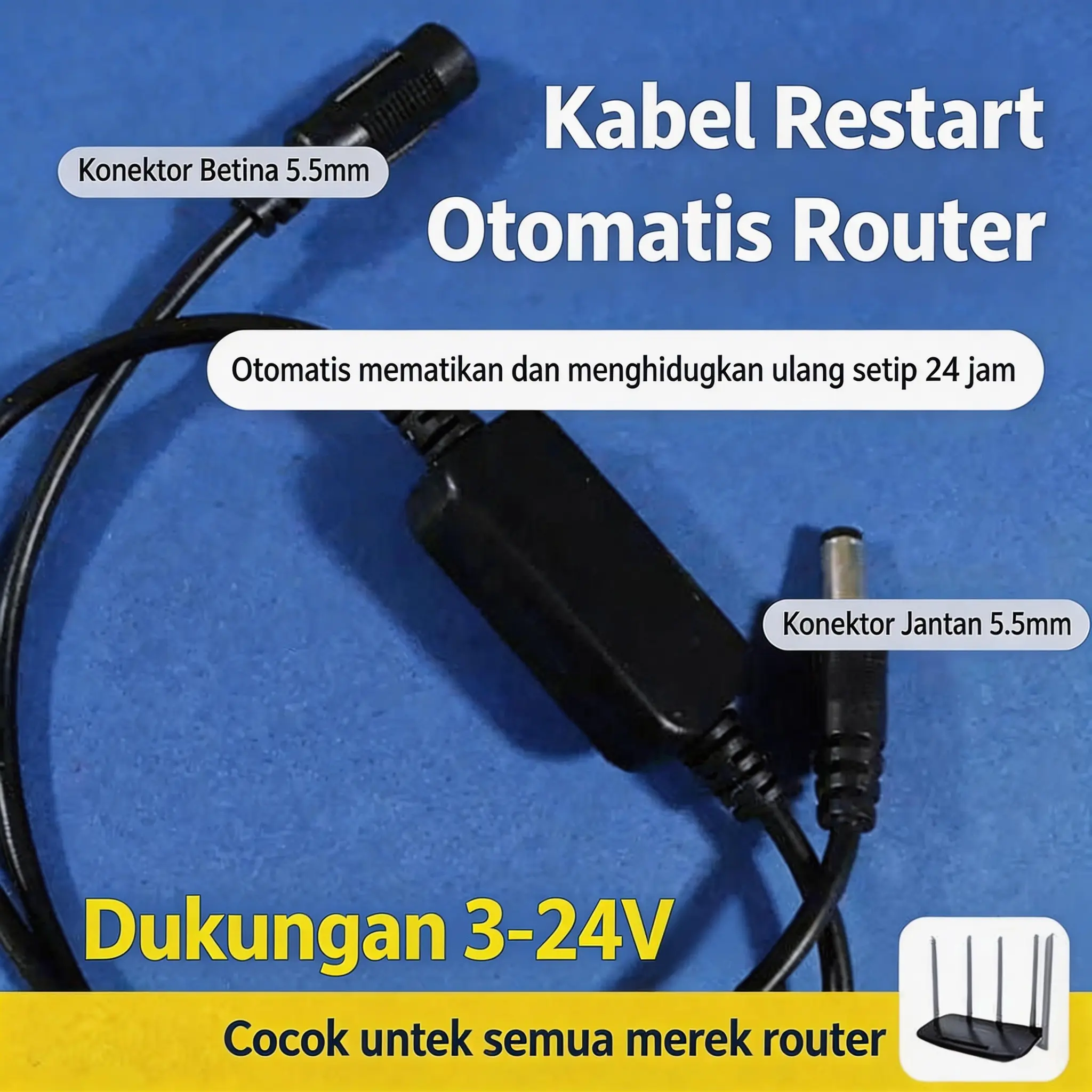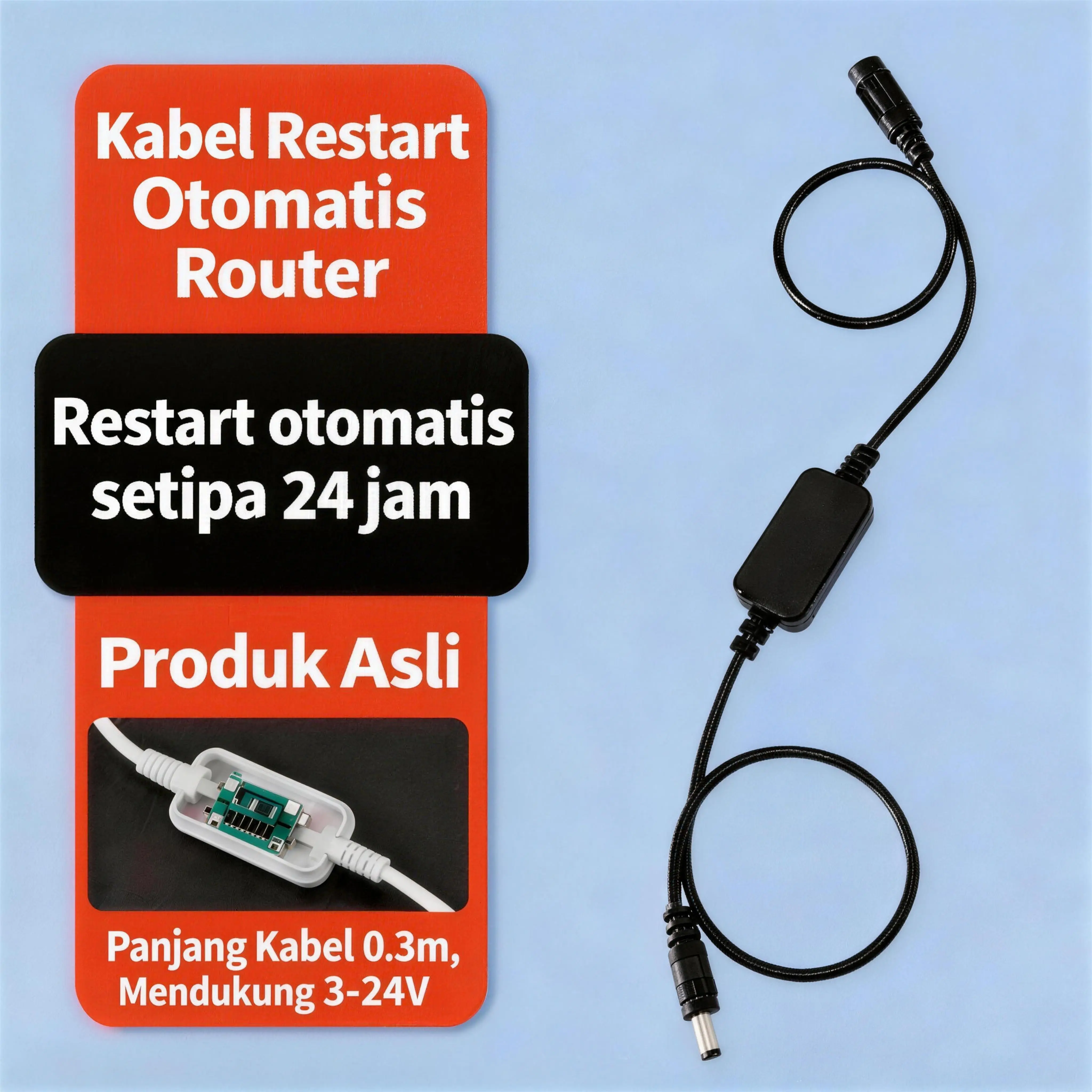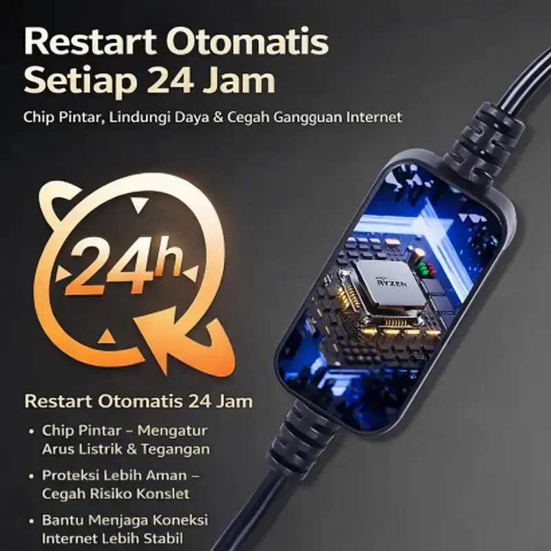 Kabel restart otomatis ini memutus dan menyambungkan kembali daya router atau modem secara otomatis setiap ±24 jam tanpa perlu dicabut manual.