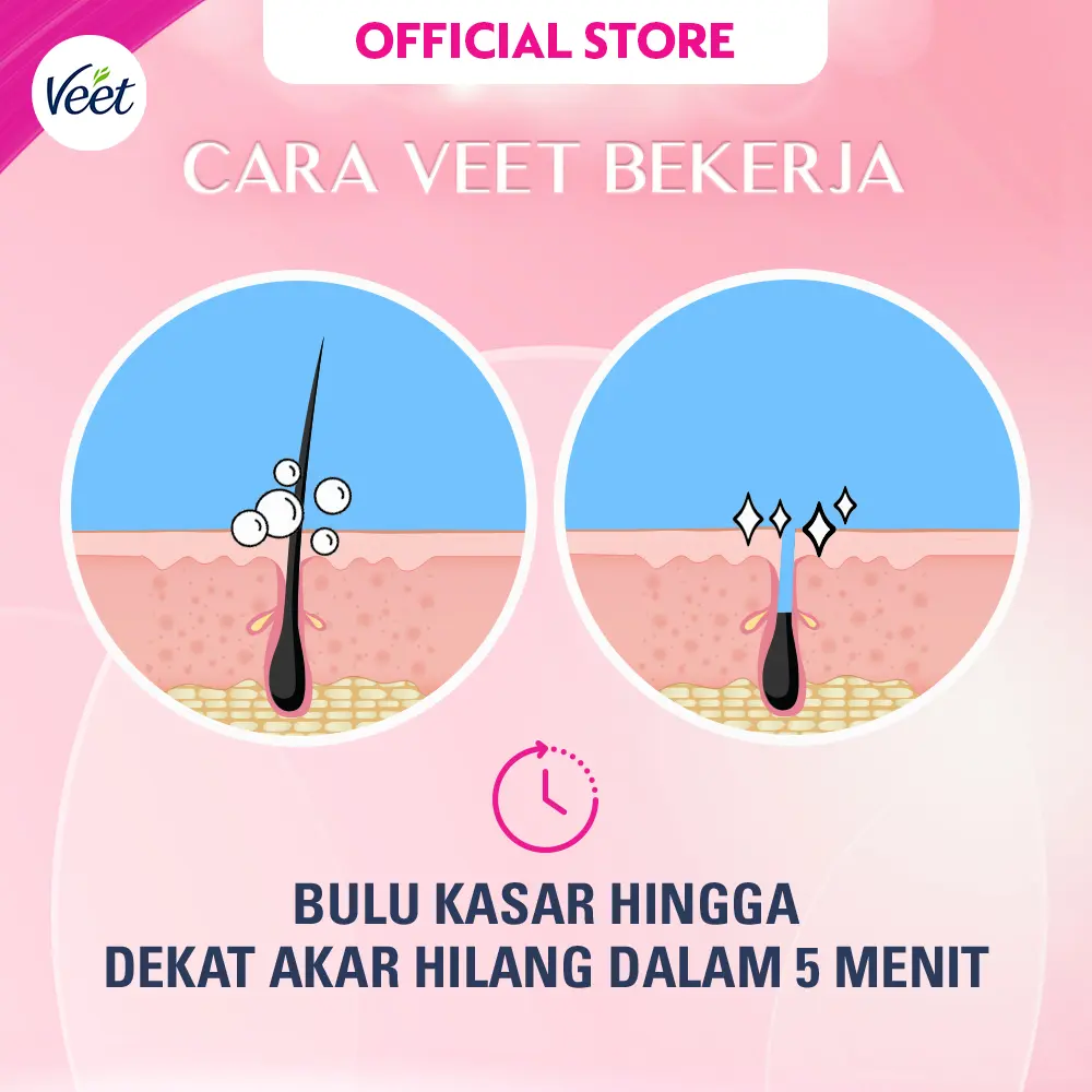 VEET menghilangkan bulu hingga dekat ke akar bahkan untuk rambut-rambut halus sekalipun. Kulit menjadi lembut dan halus hingga 7 hari. Diformulasikan untuk kulit sensitive dengan kandungan Aloe Vera yang yang menghaluskan. Kulit lebih terjaga dan selembut sutera, pertumbuhan bulu pun menjadi lebih halus.