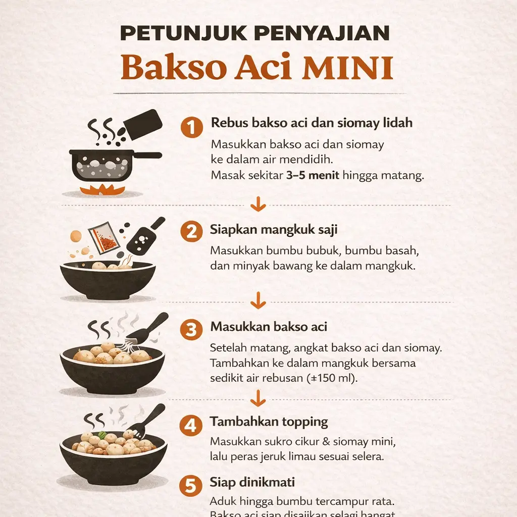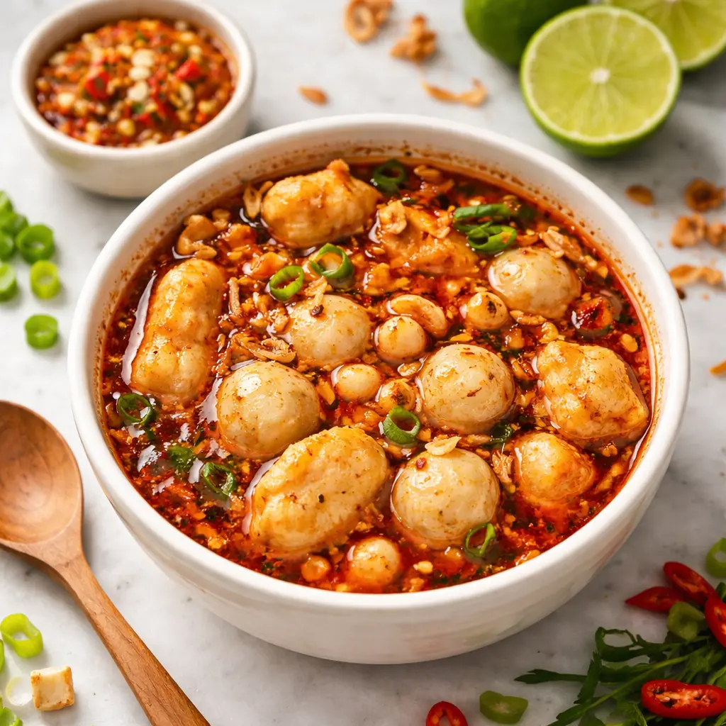Bakso Aci Mini dengan tekstur kenyal dan gurih, dilengkapi bumbu pedas khas yang bikin rasanya makin nikmat. Cocok jadi cemilan pedas atau makanan hangat saat santai di rumah.