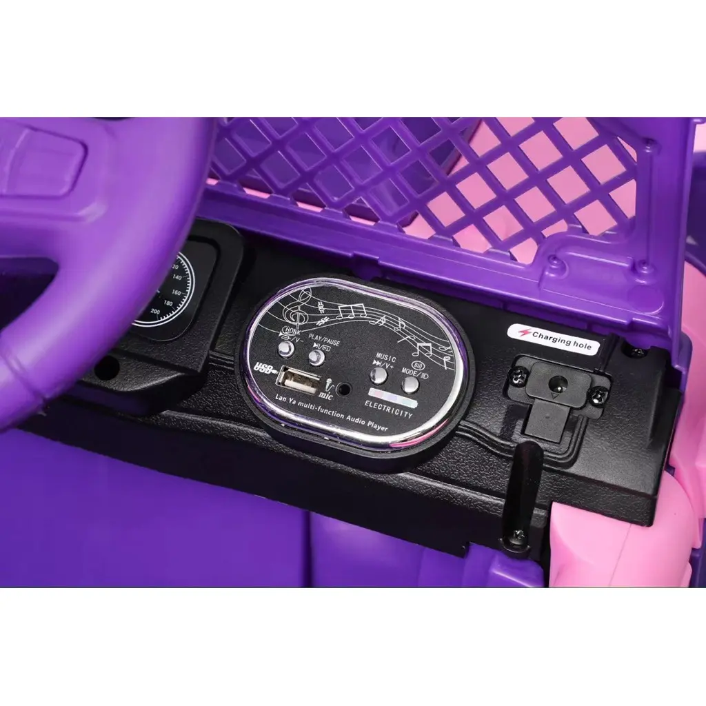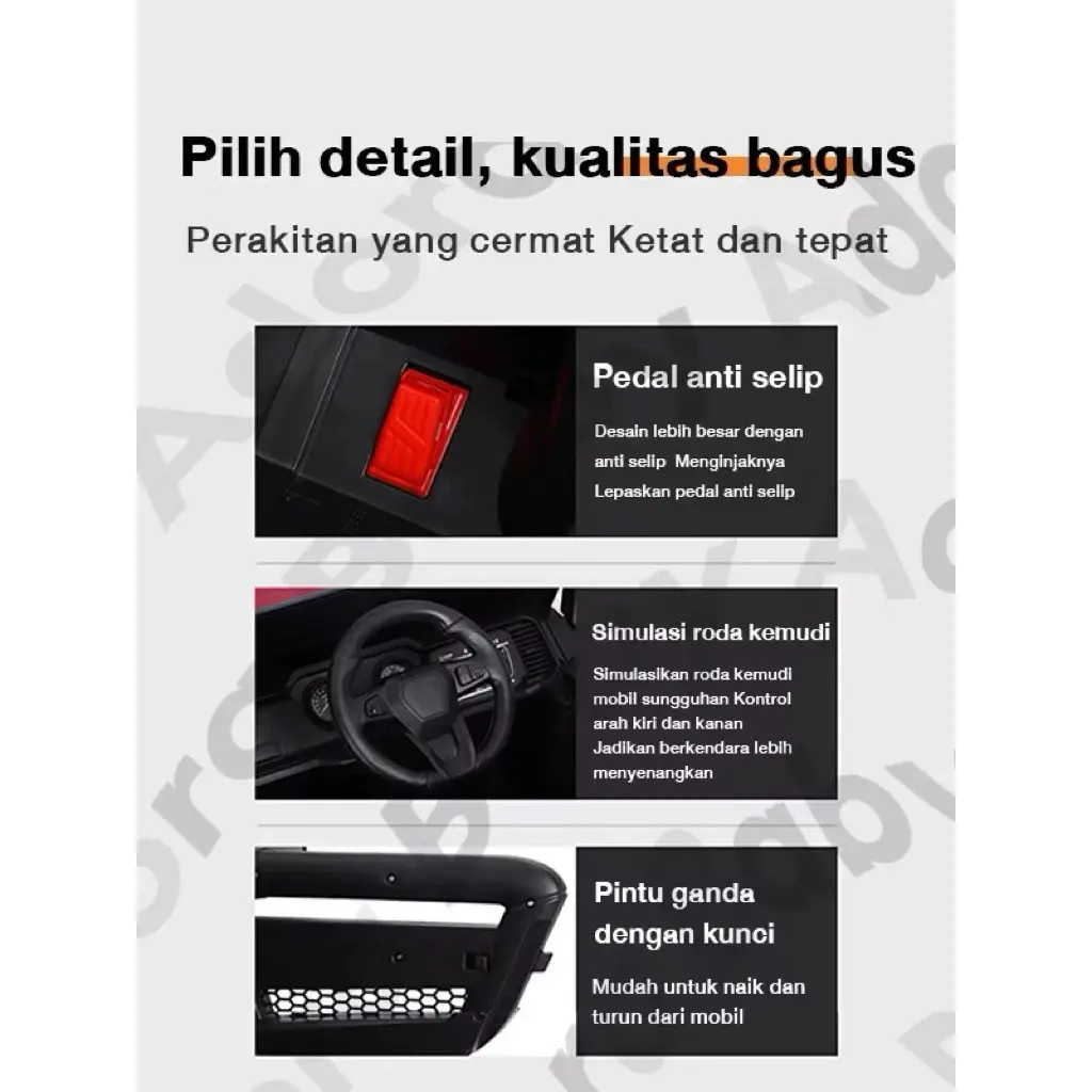 Fitur : Musik dan Klakson, 2 Gearbox 12Volt 4.5 , Sabuk Pengaman, Lampu LED, , Tempat Penyimpanan, USB Port, Bluetooth, Remot Kontrol, Transmisi Maju dan Mundur