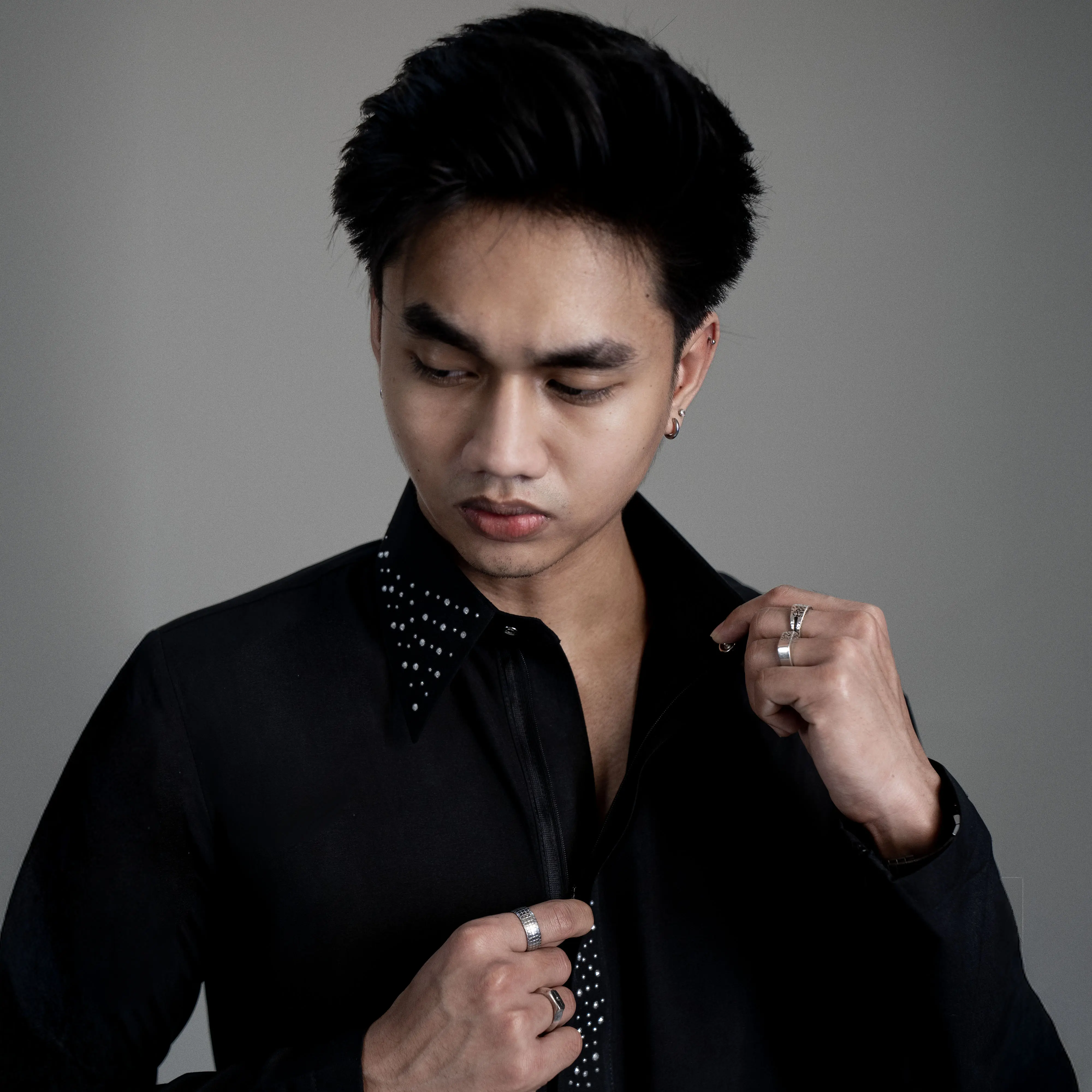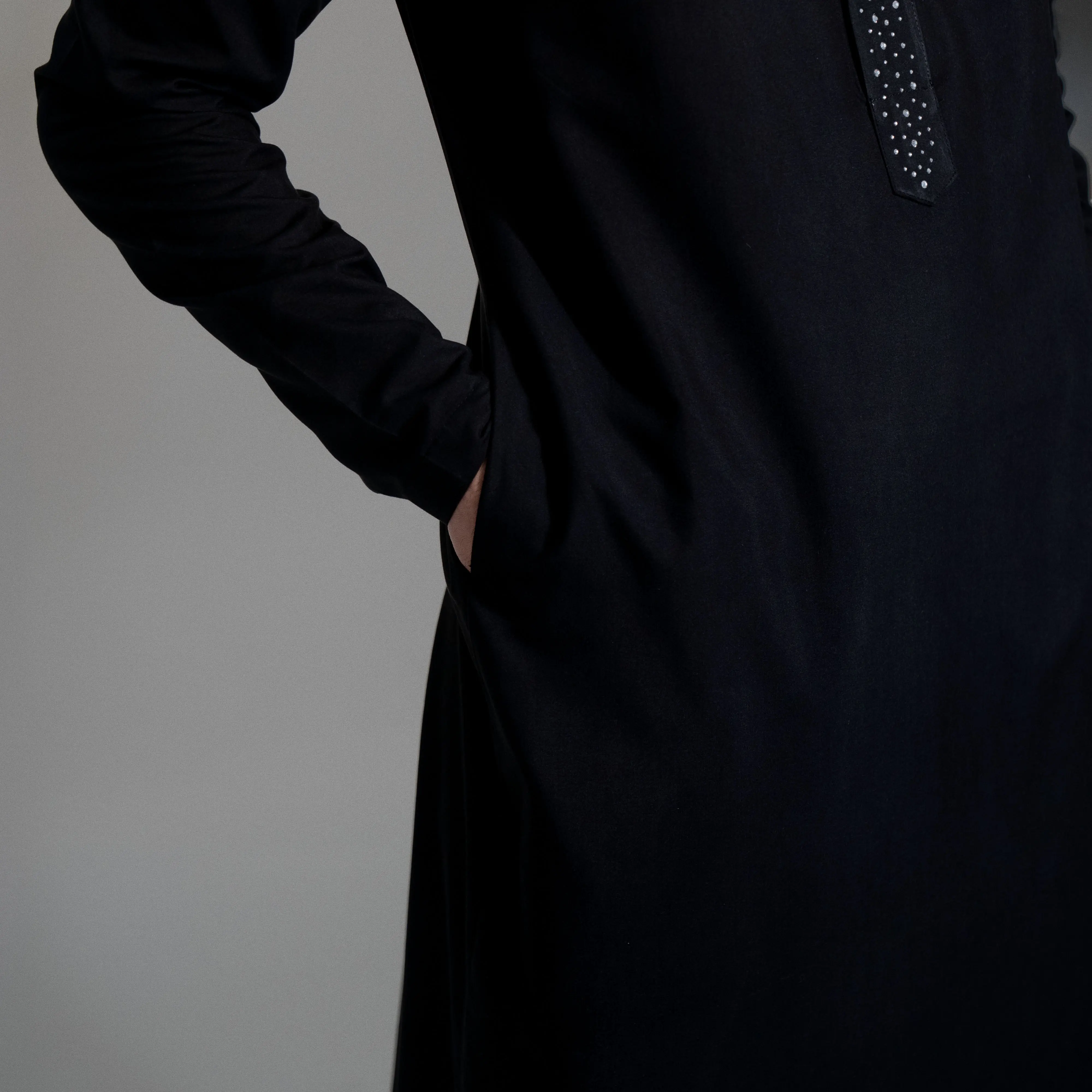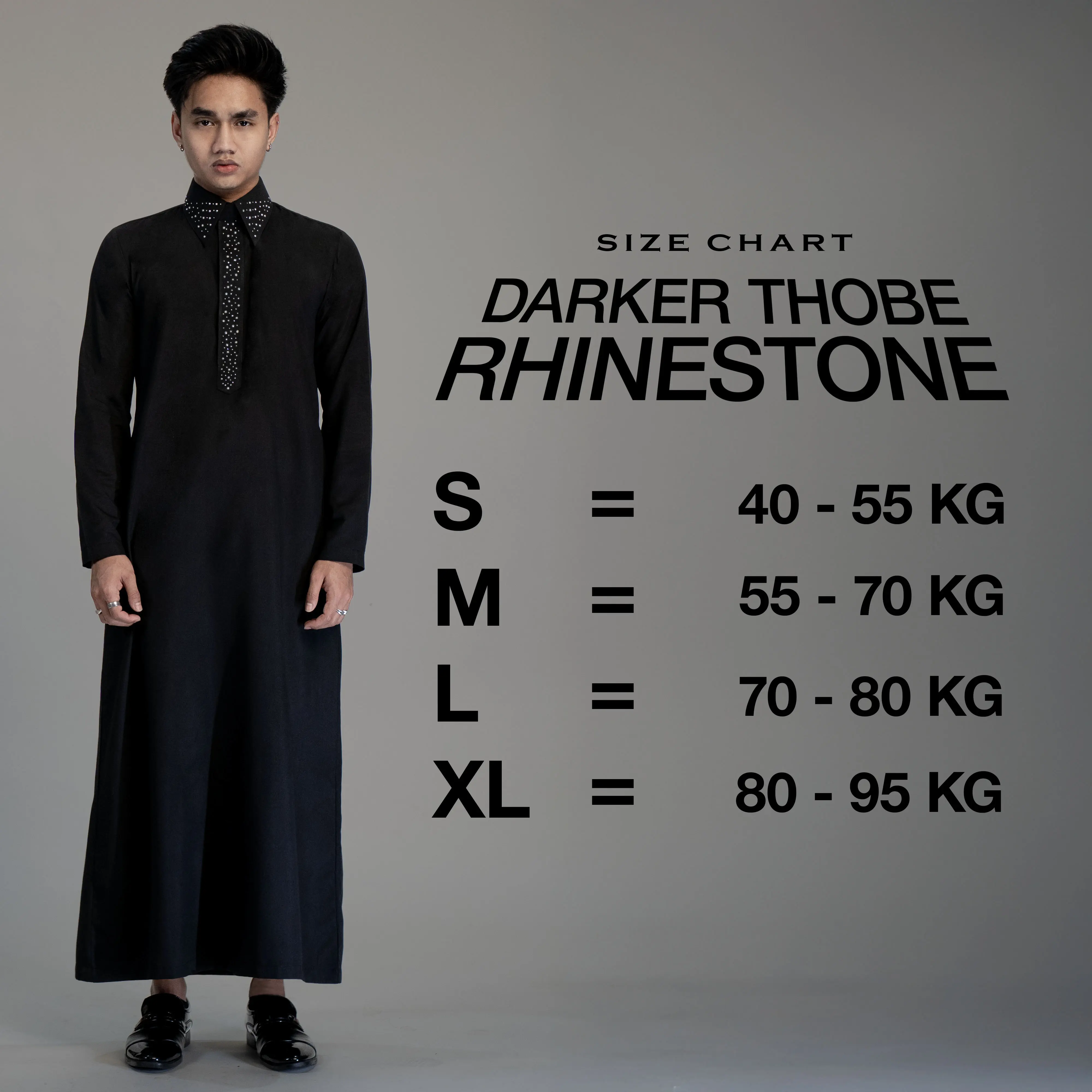 Tampil elegan, modern, dan berkelas dengan Gamis Pria Rhinestone Slim Fit warna hitam. Desain minimalis dengan detail rhinestone premium di bagian kerah dan placket memberikan kesan mewah tanpa terlihat berlebihan. Cocok dipakai untuk acara formal.