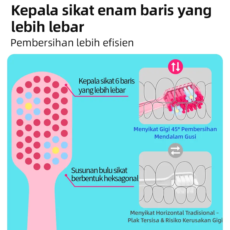 Dengan kepala sikat lebar 6 baris dan susunan bulu heksagonal, pembersihan menjadi lebih efisien dan menyeluruh. Ditambah gagang 8 sisi inovatif yang memungkinkan sikat berdiri sendiri, membantu mengalirkan air dan menjaga kebersihan kepala sikat.
