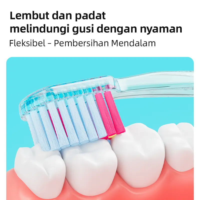 Tersedia dalam 3 varian warna elegan – Hitam klasik, Biru Muda cerah, dan Biru Tua profesional – cocok untuk semua anggota keluarga. Setiap ujung bulu sikat telah melalui proses pembulatan (end-rounded) sehingga aman membersihkan sela-sela gigi dan garis gusi tanpa melukai enamel atau jaringan sensitif.