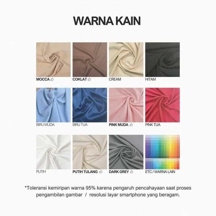 6. Toleransi kemiripan warna produk 95% karena pengaruh pencahayaan saat proses pengambilan foto produk & resolusi layar smartphone yang beragam.