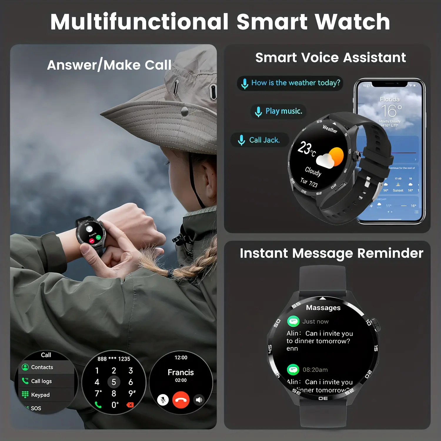Teman, terima kasih banyak atas dukungan Anda. Ini adalah jam tangan pintar olahraga multifungsi! Produk ini memiliki banyak fitur yang sangat berguna! Misalnya, setelah terhubung ke Bluetooth ponsel, Anda dapat melakukan panggilan telepon secara langsung! Fungsi asisten suara AI, buka fungsi jam tangan melalui suara! Ada juga beberapa fitur yang bisa memantau tidur, dan mengawasi kesehatan Anda! Ini semua adalah fitur yang sangat berguna!
