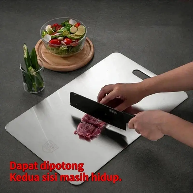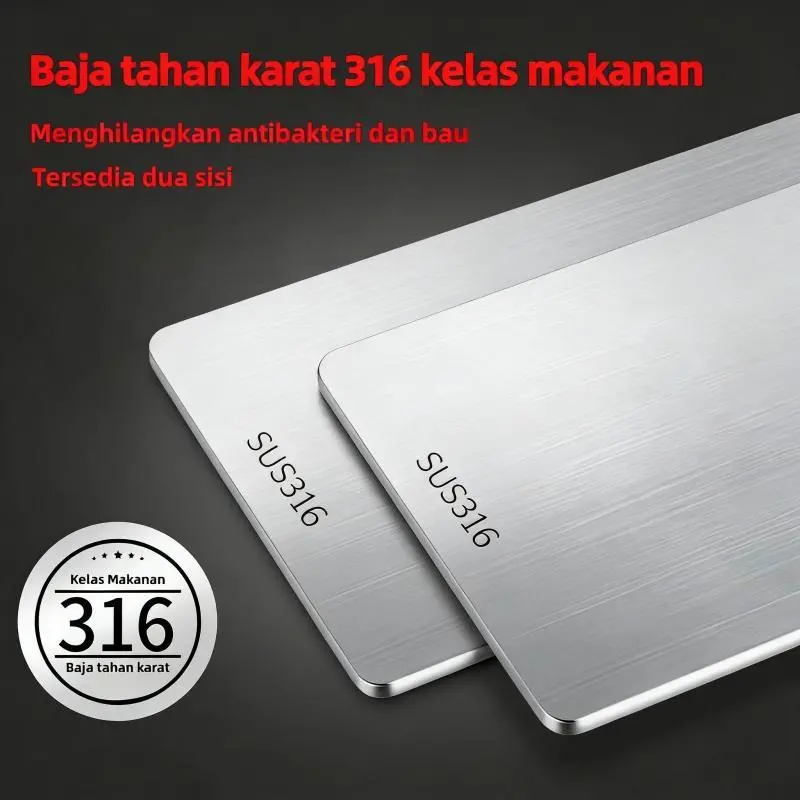 Talenan Stainless Steel 316 ini terbuat dari bahan food grade berkualitas tinggi, kuat, tidak mudah bengkok, dan cocok untuk penggunaan harian. Desain dua sisi membantu memisahkan bahan makanan agar lebih higienis dan aman digunakan.