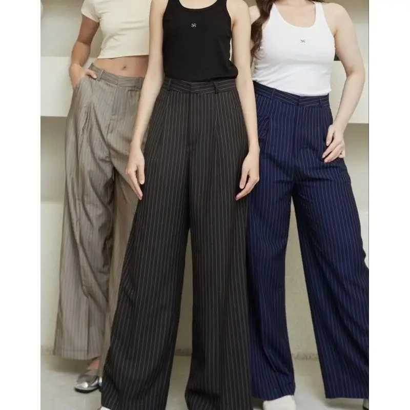 Kuma Pants / Loose Pants Stripe Trouser Wanita / Celana Anti Kusut / Celana Kulot Wanita Brown Casual Kantor
