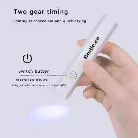 Tak perlu repot mengatur intensitas cahaya atau durasi penggunaan. Cukup tekan tombol power dan pengering kutek mini ini akan otomatis menyala selama 20 detik. Jika butuh waktu pengeringan lebih lama, tekan tombol power selama 5 detik dan alat menyala selama 60 detik.