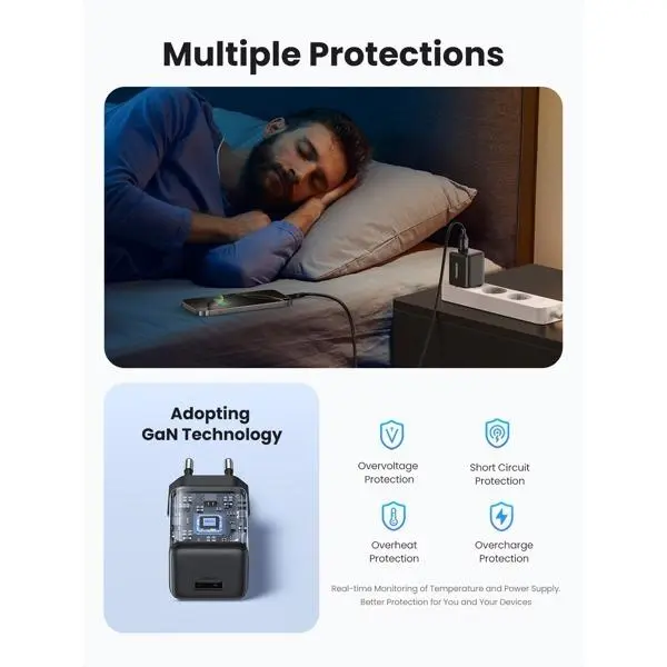 - Teknologi Gallium Nitride (GaN) merupakan material yang biasa digunakan pada semikonduktor kelas atas yang akan membantu charger untuk tidak banyak mengeluarkan hawa panas. Kepala charger akan tetap dingin dengan ukuran yang lebih kecil. Telah memenuhi standar keamanan internasional, serta mampu mengatasi daya tinggi yang dihasilkan.
