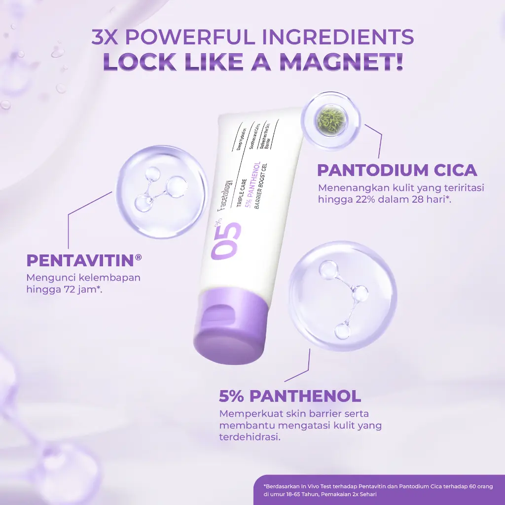 - 5% Panthenol : Memperkuat skin barrier serta membantu mengatasi kulit yang terdehidrasi.