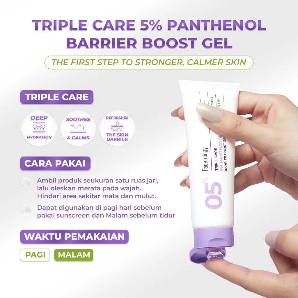 Diperkaya dengan 5% Panthenol (Pro-Vitamin B5), pelembab ini membantu menyegarkan kulit dan menjaga kelembaban sepanjang hari tanpa terasa berat di kulit. Triple Care 5% Panthenol Barrier Boost Gel memiliki texture Water Gel, Seringan air, langsung menyerap tanpa rasa lengket. Segar & ringan, cocok buat kulit berminyak maupun acne-prone.