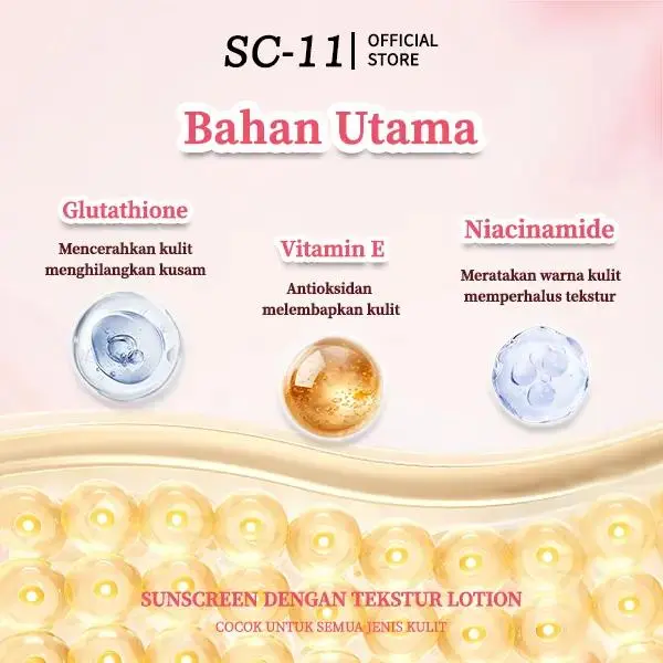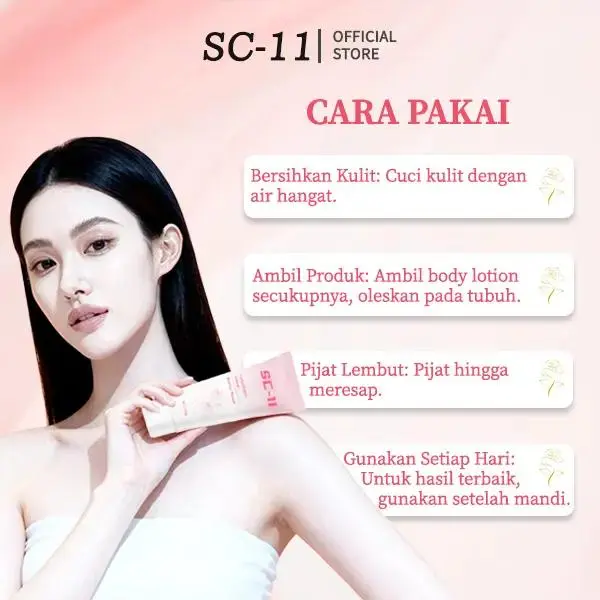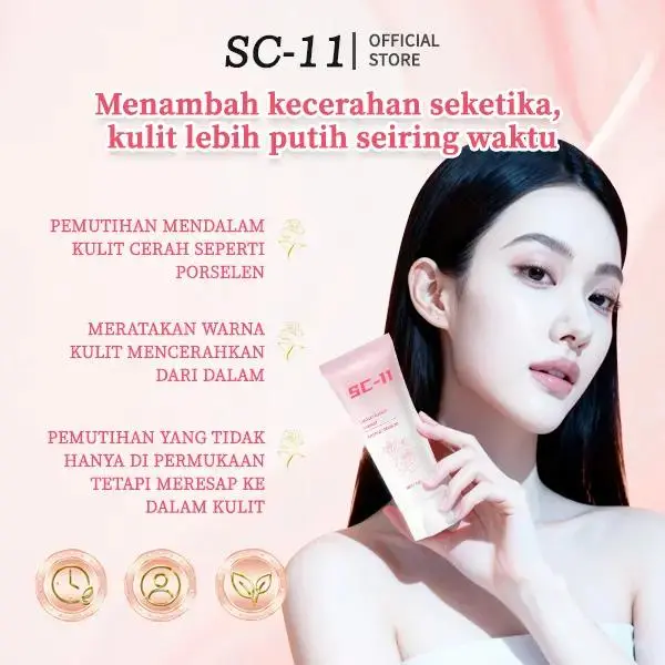 SC-11 bukan sekadar lotion biasa! Diperkaya bahan aktifpencerah & pelembap intensif, produk ini bantumemperbaiki tekstur kulit, mengurangi belang, danmemberikan efek putih natural.