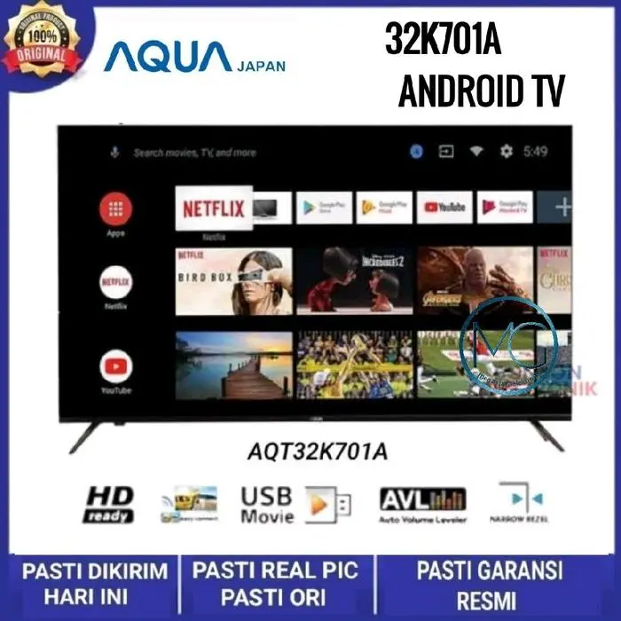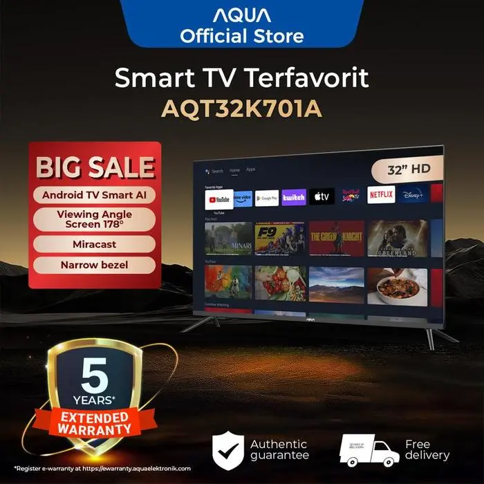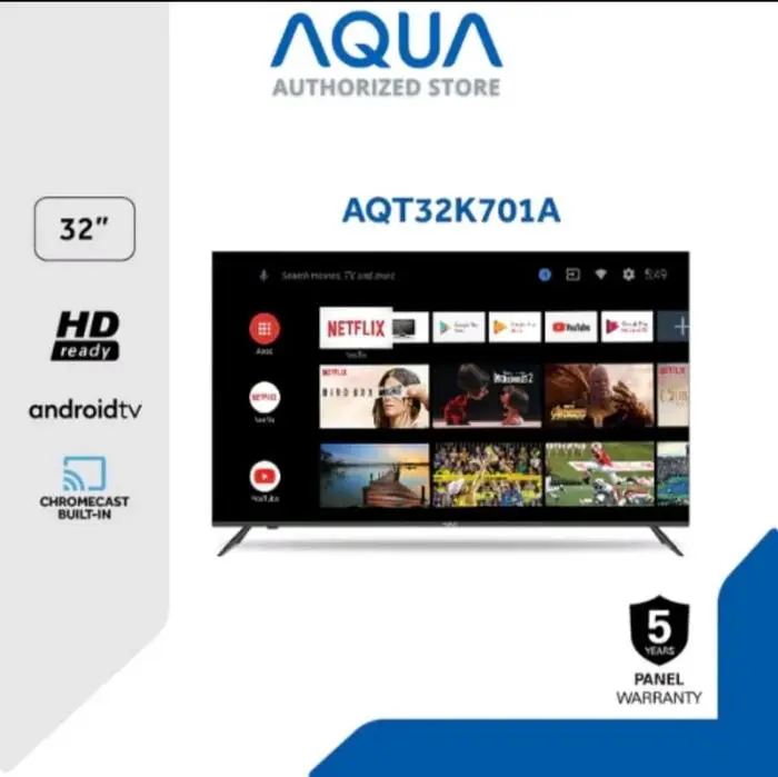 "Teknologi AQUA Elektronik bisa Anda nikmati di SMART TV 32 inci. Kecerdasan buatan yang mencakup Intelligent Voice Control, Android Device IoT Hub, dan Chromecast Built-in mengintegrasikan segala keunggulan fitur ponsel pintar ke dalam layar televisi yang lebih besar. Fitur bluetooth yang terpasang membuat Anda makin nyaman menikmati waktu luang. Miliki segera AQT32K701A di ruang keluarga Anda, untuk pengalaman menonton yang tak lagi monoton.