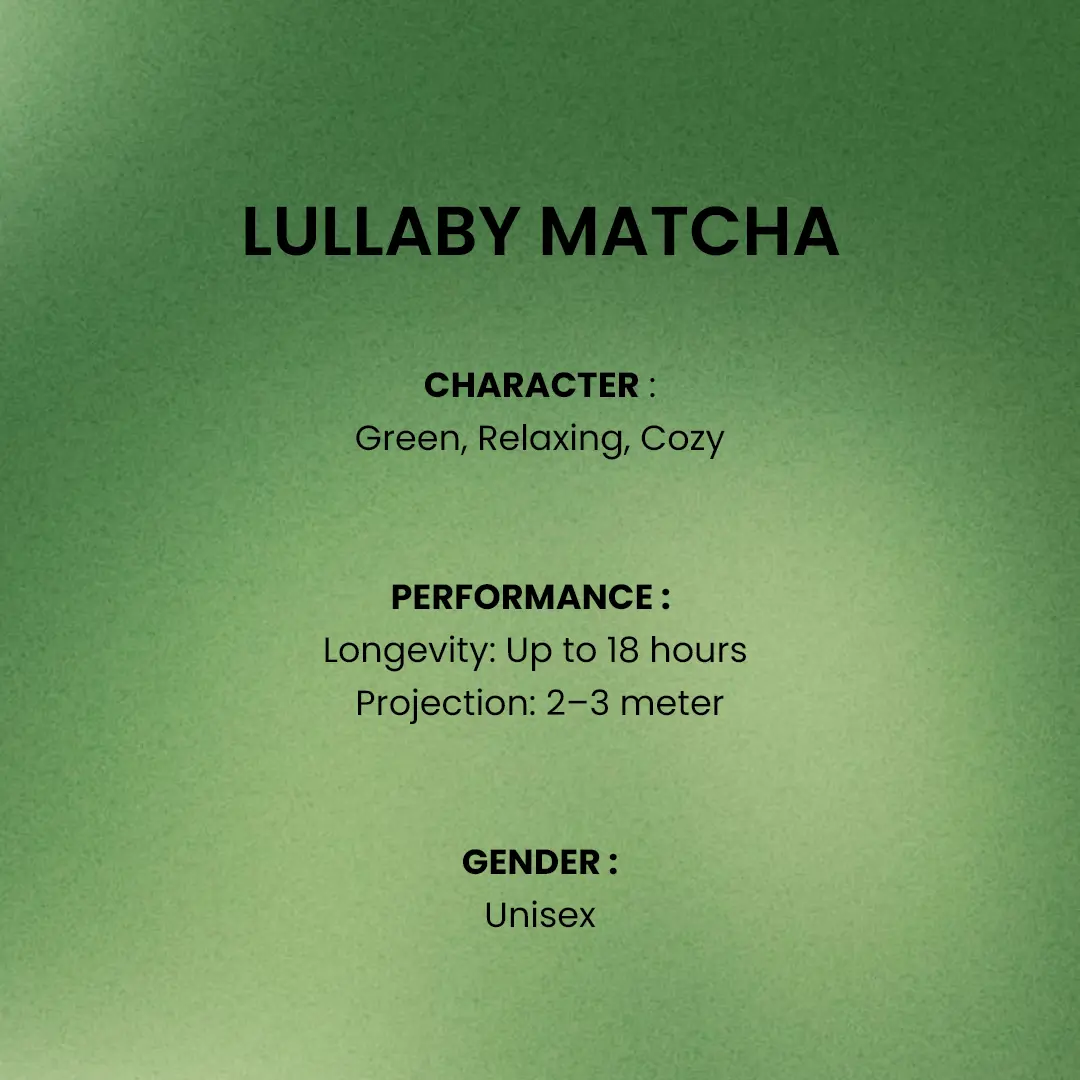 Dengan karakter wangi yang Fresh, Clean, dan Relaxing, Lullaby Matcha menghadirkan sensasi kesegaran dari coconut water yang creamy, ringan serta menenangkan. Dipadukan dengan sedikit pahit matcha, serta nuansa fig dan incense yang halus, menciptakan aroma yang cozy dan effortless. Memberikan kesan Calmness dan Mindfulness, cocok untuk menemani aktivitas harian, bekerja, hingga menikmati momen santai dengan rasa segar yang tidak berlebihan.