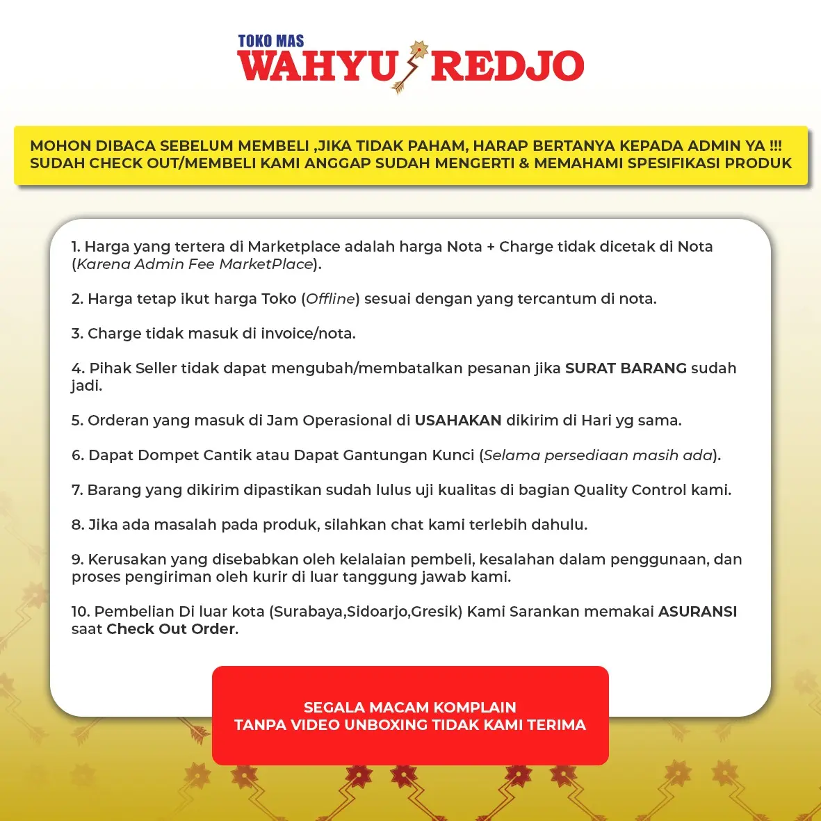 -Harga perhiasan marketplace Toko Emas Wahyu Redjo Online sama dengan Toko Offline.