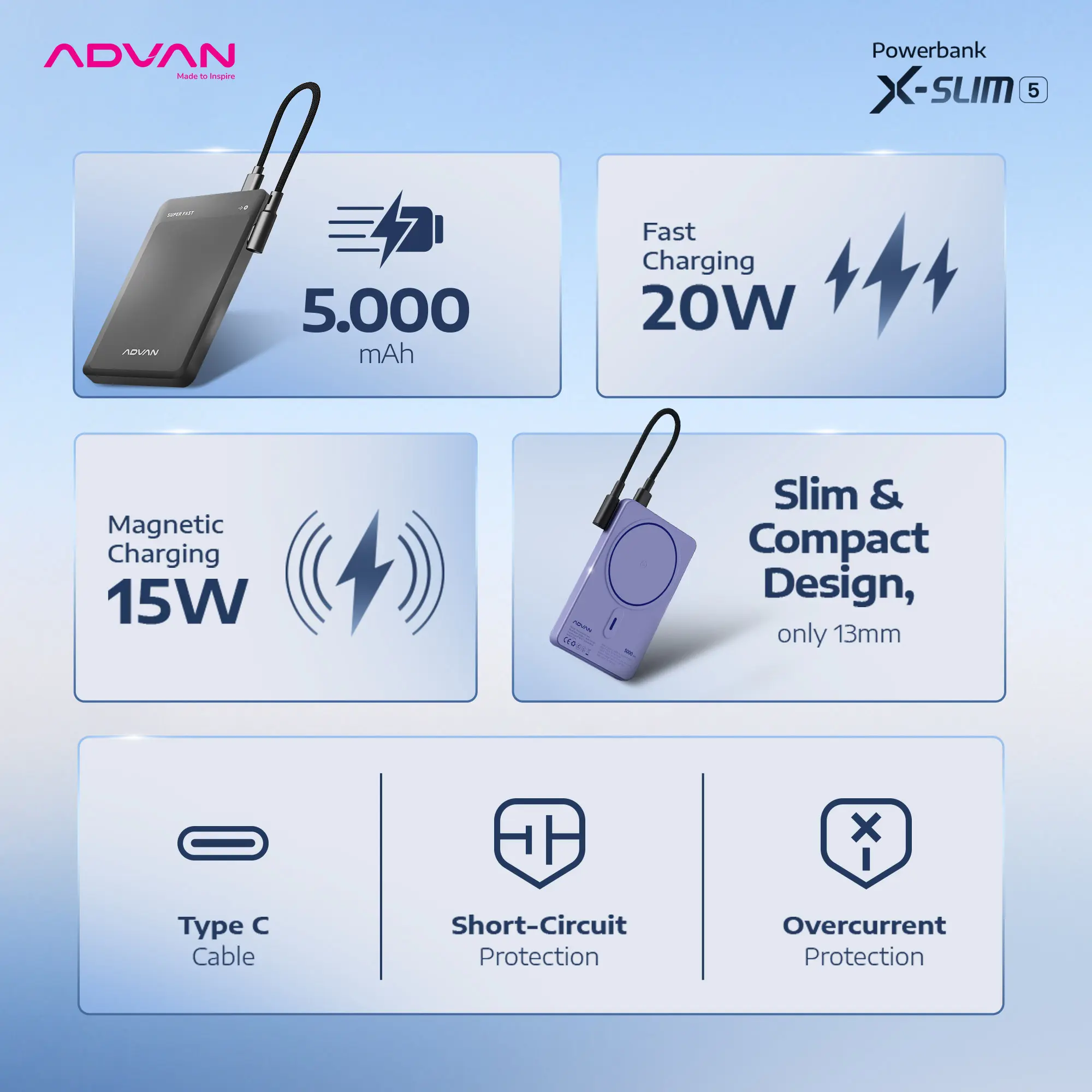 [EXCLUSIVE CREATOR] ADVAN X SLIM 5 Wireless Powerbank 5000 mAh Magsafe Integrated Type-C Fast Charging 20W Slim Compact Ultralight Power Delivery 3.0 Short-Circuit Protection Overcurrent Protection