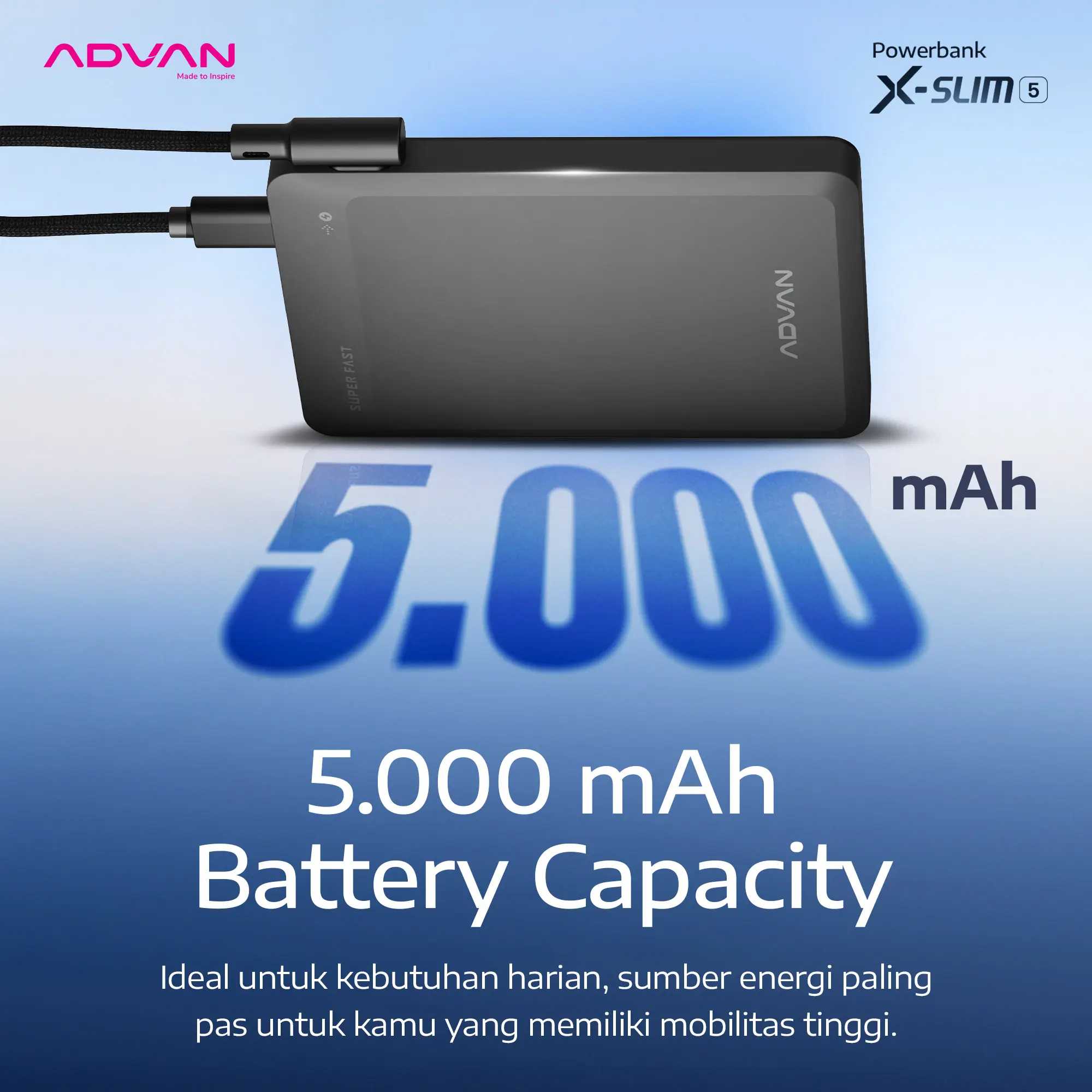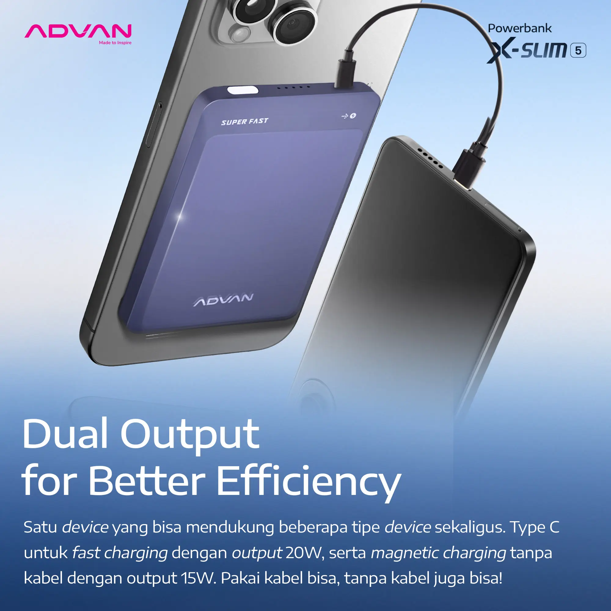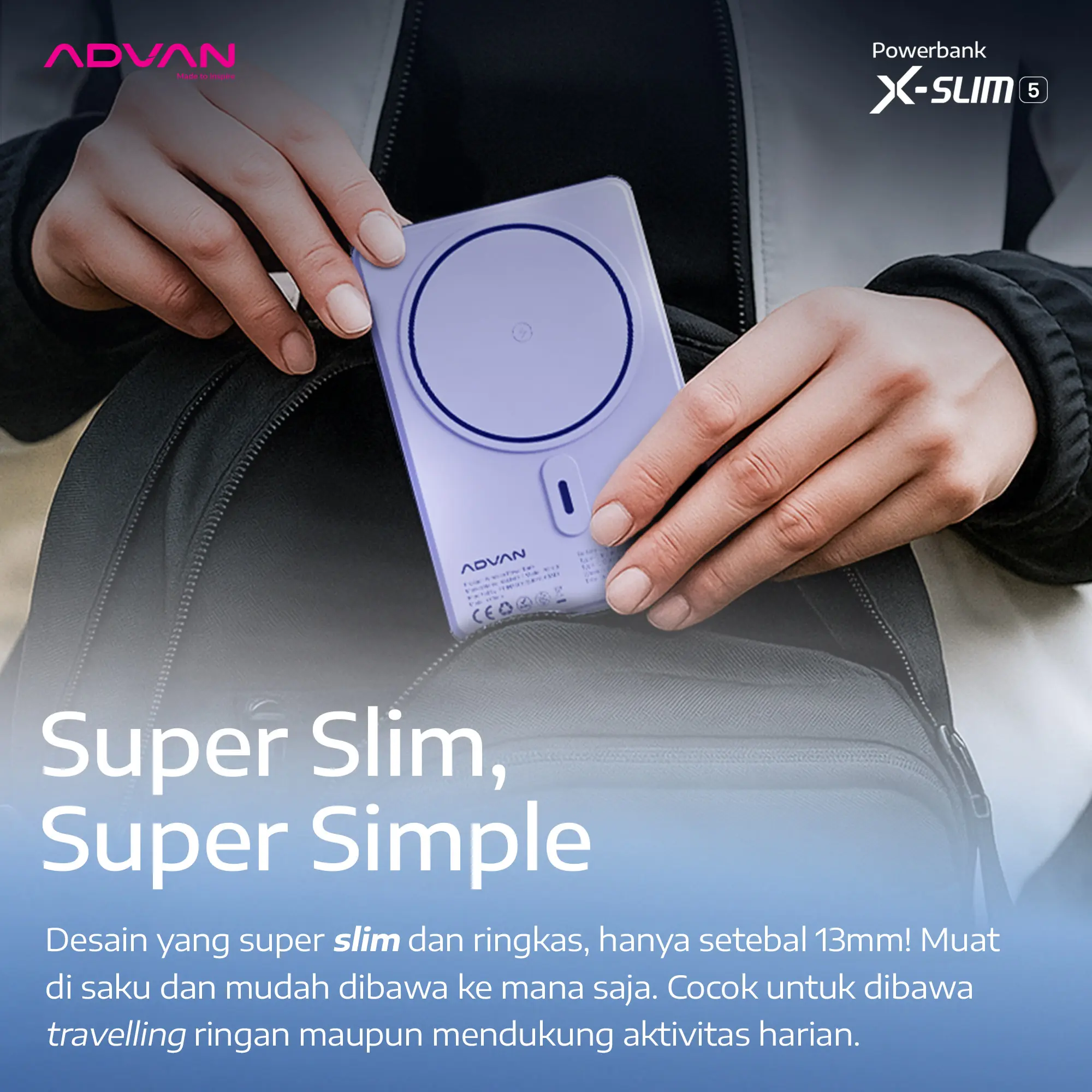 ADVAN WIRELESS POWERBANK X SLIM 5 5000mAh MAGSAFE INTEGRATED TYPE C FAST CHARGING ADVAN menghadirkan powerbank terbaru dengan upgrade fitur wireless charging. Powerbank X SLIM 5 hadir untuk memudahkan pengguna yang khawatir akan kehabisan daya baterai perangkat. Powerbank X SLIM 5 memiliki desain yang lebih ringkas dengan ukuran yang lebih kecil nyaman dibawa kemanapun dan kapanpun. Serta fitur wireless charging yang dapat memudahkan pengguna dalam penggunaannya. Smart Solution. ADVAN X SLIM 5 memberikan solusi praktis untuk mengisi daya perangkat elektronik Anda dimanapun dan kapanpun. Dengan variasi pilihan port charging membantu pengguna dalam keadaan darurat tanpa khawatir akses stop kontak terbatas. Wireless Charging. Pengguna dapat dengan mudah mengisi daya perangkat tanpa perlu menyambungkan kabel, sehingga terkesan lebih rapih dan terorganisir. Compact Design. X SLIM 5 memiliki desain yang ringkas, kecil dan ringan. Dengan desain ini powerbank mudah dibawa kemanapun tanpa perlu terbebani dengan ukuran dan beratnya. Large Battery Capacity. Kapasitas baterai 5000mAh Powerbank X SLIM 5 mampu mengisi banyak daya perangkat. Dengan kapasitas yang besar memberikan efisiensi dalam penggunaannya. Quick Charge. ADVAN Powerbank sudah mendukung Fast Charging up to 20W. Fitur ini memberikan efisiensi waktu bagi pengguna. Dengan fitur fast charging pengguna tidak perlu lagi khawatir ketika mengisi daya perangkat akan menyita banyak waktu. High Level Protection. Fitur Over-Current Protection dan Short Circuit Protection memastikan perangkat Anda aman dari arus berlebih dan korsleting. Spesifikasi : Model   : X SLIM 5 Dimension  : 98mm x 67mm x 12mm Material  : Surface shell PC+ABS Battery Material : Polymer battery 706074 Battery Capacity : 5000mAh Wireless Charging : 5W 7.5W10W15W Type-C port input/output  Input : 5V/2.4A; 9V/2A ; 12V/1.5A Output Protocol : 5V/3A 9V/2.22A ,12V/1.67A Isi Dalam Kemasan : 1x Powerbank X SLIM 5 1x C to C Cable 1x Manual Book 1x Kartu Garansi GARANSI RESMI 1 TAHUN ADVAN INDONESIA