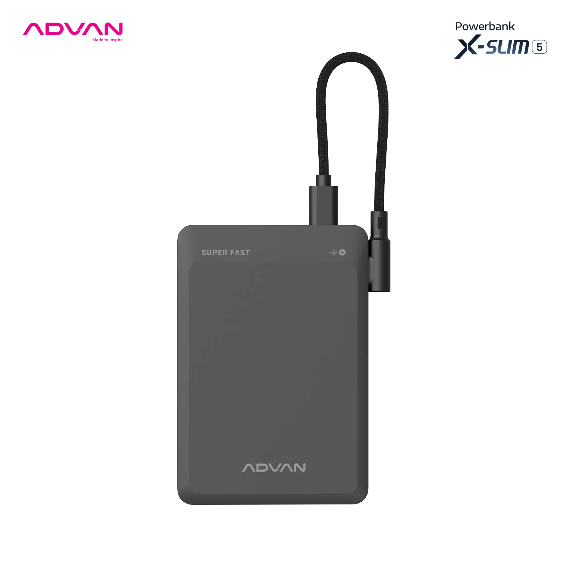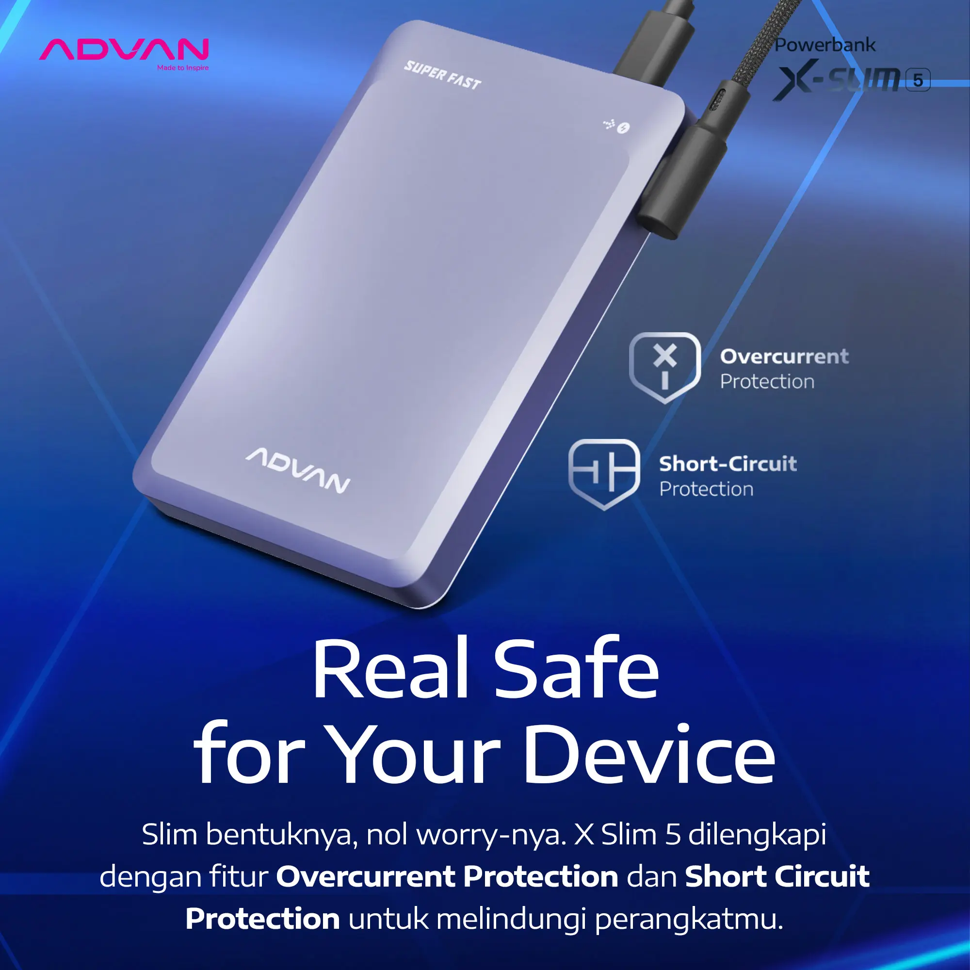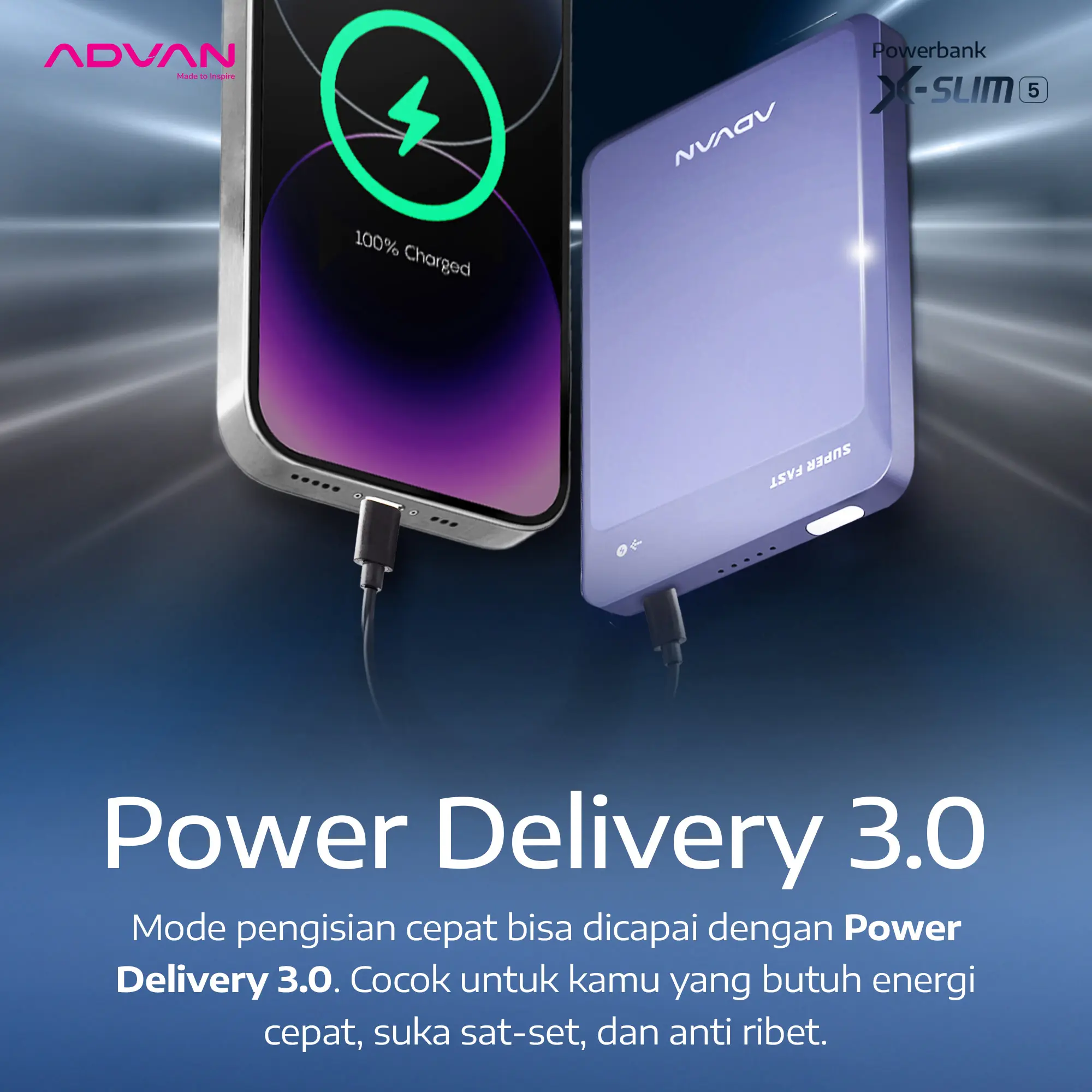 ADVAN WIRELESS POWERBANK X SLIM 5 5000mAh MAGSAFE INTEGRATED TYPE C FAST CHARGING ADVAN menghadirkan powerbank terbaru dengan upgrade fitur wireless charging. Powerbank X SLIM 5 hadir untuk memudahkan pengguna yang khawatir akan kehabisan daya baterai perangkat. Powerbank X SLIM 5 memiliki desain yang lebih ringkas dengan ukuran yang lebih kecil nyaman dibawa kemanapun dan kapanpun. Serta fitur wireless charging yang dapat memudahkan pengguna dalam penggunaannya. Smart Solution. ADVAN X SLIM 5 memberikan solusi praktis untuk mengisi daya perangkat elektronik Anda dimanapun dan kapanpun. Dengan variasi pilihan port charging membantu pengguna dalam keadaan darurat tanpa khawatir akses stop kontak terbatas. Wireless Charging. Pengguna dapat dengan mudah mengisi daya perangkat tanpa perlu menyambungkan kabel, sehingga terkesan lebih rapih dan terorganisir. Compact Design. X SLIM 5 memiliki desain yang ringkas, kecil dan ringan. Dengan desain ini powerbank mudah dibawa kemanapun tanpa perlu terbebani dengan ukuran dan beratnya. Large Battery Capacity. Kapasitas baterai 5000mAh Powerbank X SLIM 5 mampu mengisi banyak daya perangkat. Dengan kapasitas yang besar memberikan efisiensi dalam penggunaannya. Quick Charge. ADVAN Powerbank sudah mendukung Fast Charging up to 20W. Fitur ini memberikan efisiensi waktu bagi pengguna. Dengan fitur fast charging pengguna tidak perlu lagi khawatir ketika mengisi daya perangkat akan menyita banyak waktu. High Level Protection. Fitur Over-Current Protection dan Short Circuit Protection memastikan perangkat Anda aman dari arus berlebih dan korsleting. Spesifikasi : Model   : X SLIM 5 Dimension  : 98mm x 67mm x 12mm Material  : Surface shell PC+ABS Battery Material : Polymer battery 706074 Battery Capacity : 5000mAh Wireless Charging : 5W 7.5W10W15W Type-C port input/output  Input : 5V/2.4A; 9V/2A ; 12V/1.5A Output Protocol : 5V/3A 9V/2.22A ,12V/1.67A Isi Dalam Kemasan : 1x Powerbank X SLIM 5 1x C to C Cable 1x Manual Book 1x Kartu Garansi GARANSI RESMI 1 TAHUN ADVAN INDONESIA
