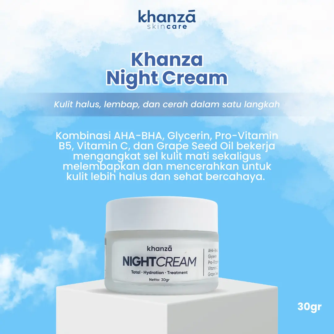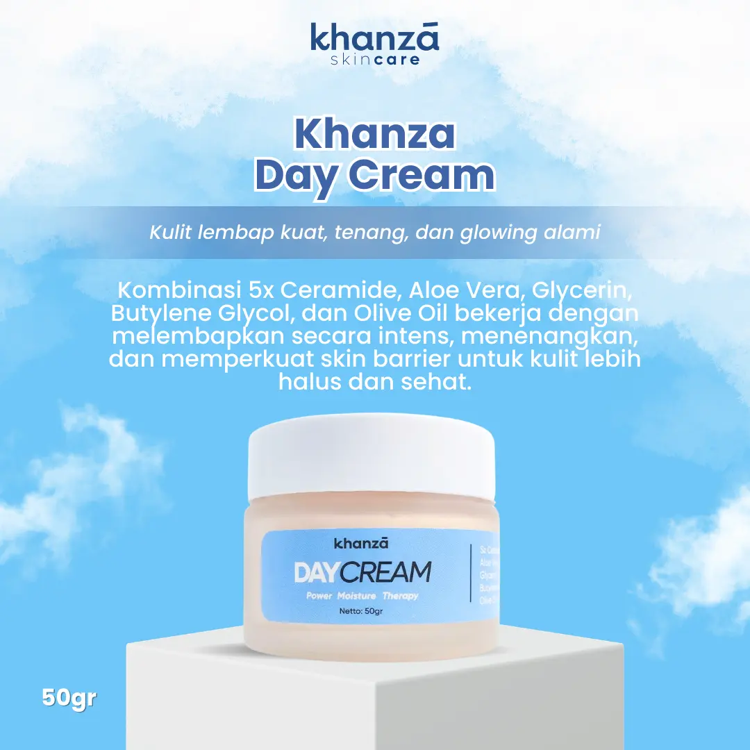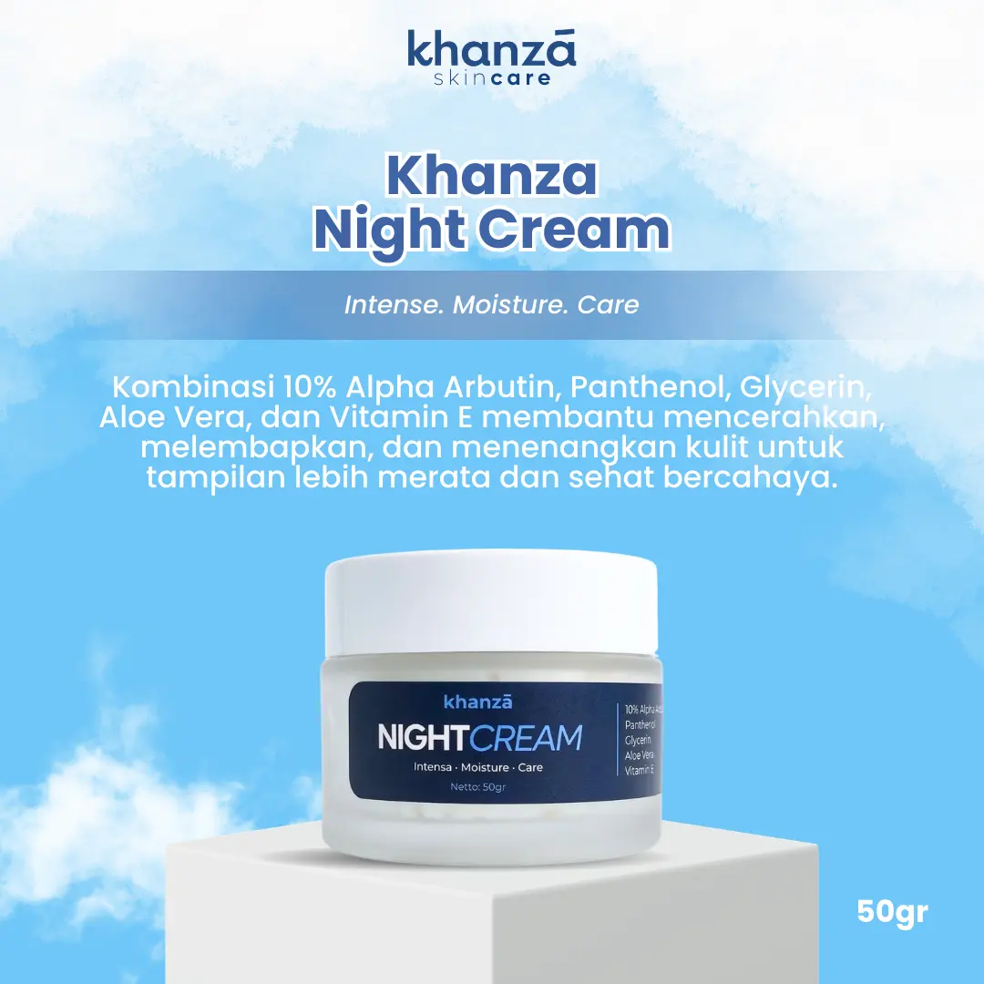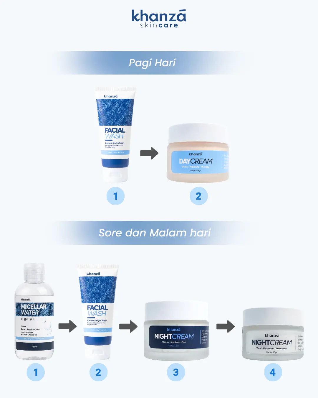 KHANZA 5IN1 Skincare Brightening & Skin Barrier Series GARANSI TIDAK ADA HASIL UANG KEMBALI Isi Paket & BPOM: Day Cream 5x Ceramide (50g) - NA18250115500 Night Cream 10% Alpha Arbutin (50g) - NA18250115378 Night Cream AHA-BHA (30g) - NA18250115694 Micellar Water Pure Fresh (125ml) - NA18250118255 Facial Wash Cleaned Bright (100ml) - NA18251209220 SOLUSI WAJAH GLOWING, BEBAS KUSAM & SKIN BARRIER KUAT! Dapatkan hasil wajah cerah maksimal dengan rangkaian KHANZA Skincare. Paket ini dirancang khusus untuk memperbaiki tekstur kulit, memudarkan noda hitam, dan menjaga kelembapan hingga lapisan terdalam dan menghilangkan bekas jerawat. Kandungan & Manfaat Utama: 1. Day Cream (5x Ceramide + Olive Oil) - 5x Ceramide: Memperkuat skin barrier & melindungi kulit dari iritasi. - Glycerin & Olive Oil: Menjaga wajah tetap lembap & kenyal sepanjang hari tanpa rasa lengket. 2. Night Cream High Dose (10% Alpha Arbutin + Vitamin E) - 10% Alpha Arbutin: Brightening Hero yang ampuh pudarkan bekas jerawat & whitening glowing. - Panthenol: Menenangkan kulit & mempercepat regenerasi saat tidur. 3. Night Cream Glow (AHA-BHA + Grape Seed Oil) - AHA & BHA: Eksfoliasi lembut untuk mengecilkan pori-pori, menghaluskan tekstur kulit, dan menghilangkan bekas jerawat dan noda hitam. - Grape Seed Oil: Nutrisi intensif agar wajah plumpy saat bangun pagi. - Cleansing Duo (Micellar Water & Facial Wash) - Deep Cleansing: Mengangkat makeup & polusi seperti magnet. - Moisture-Lock: Wajah bersih total tapi tetap lembut, nggak bikin kulit "ketarik". 4. Facial Wash - Membersihkan kotoran dan makeup dari aktivitas sehari-hari - Kulit terasa lembab dan halus - Membuat kulit bersih dan cerah 5. Micellar Water - Membersihkan makeup waterproof dan kotoran - Memberikan rasa segar dan lembab - Tidak terasa lengket setelah membersihkan wajah Cara Penggunaan (Step-by-Step): - Micellar Water: Tuang ke kapas, usap lembut untuk angkat kotoran (Pagi & Malam). - Facial Wash: Busakan di tangan, pijat wajah perlahan, lalu bilas bersih. - Day Cream 50 gr: Gunakan pada pagi/siang hari secara merata di wajah & leher. - Night Cream 50 gr 10% Alpha Arbutin: Gunakan sore hari setelah mandi. - Night Cream AHA-BHA 30 gr: Gunakan malam hari sebelum tidur untuk hasil glowing maksimal.