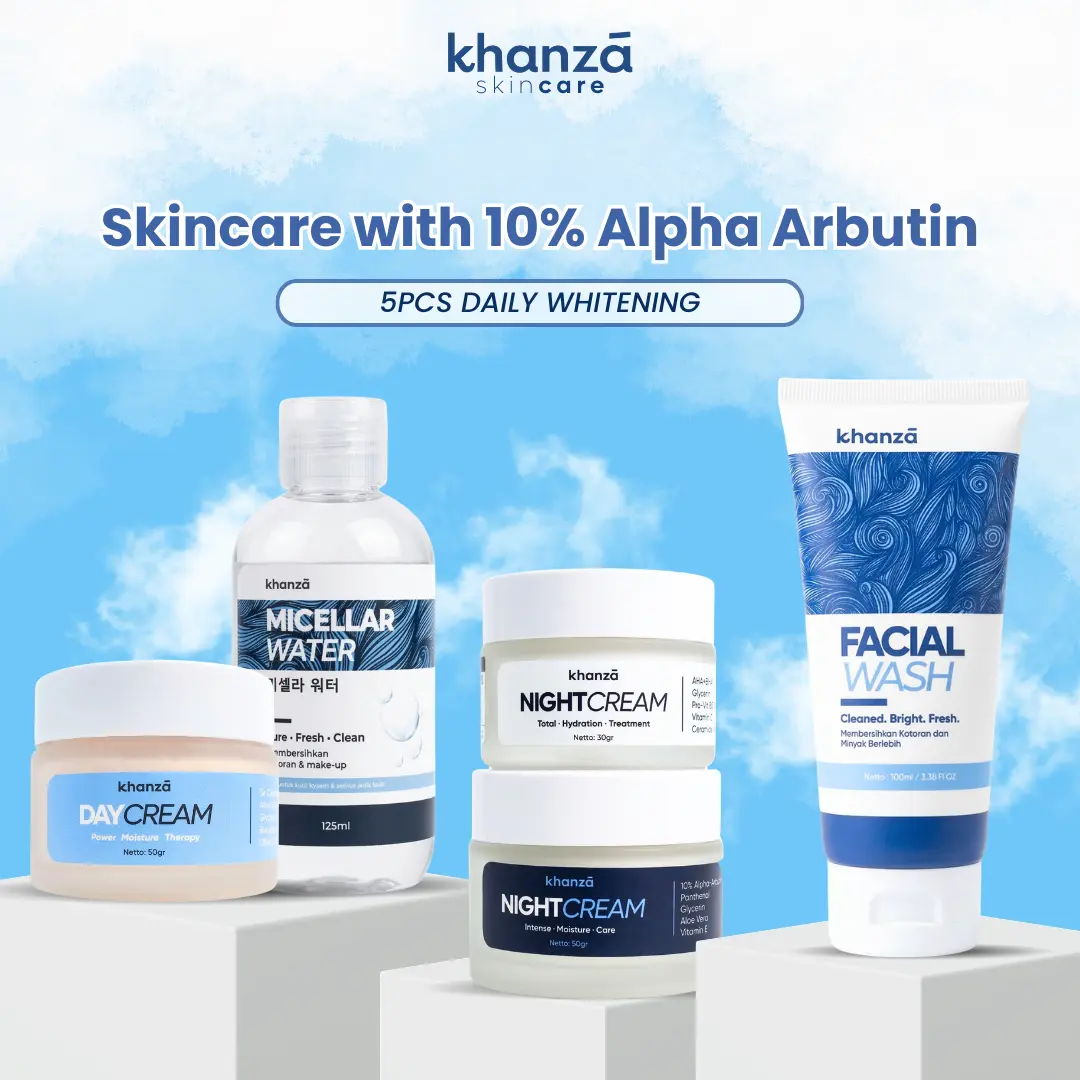 KHANZA SKINCARE 5 in 1  - Paket Skincare Brightening Penghilang Kusam & Bekas Jerawat - Aman BPOM - Day Night Cream Alpha Arbutin AHA BHA Facial Wash Micellar Water