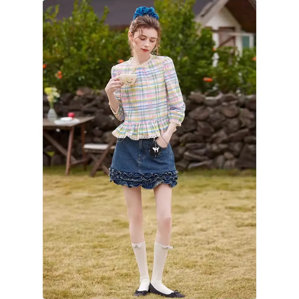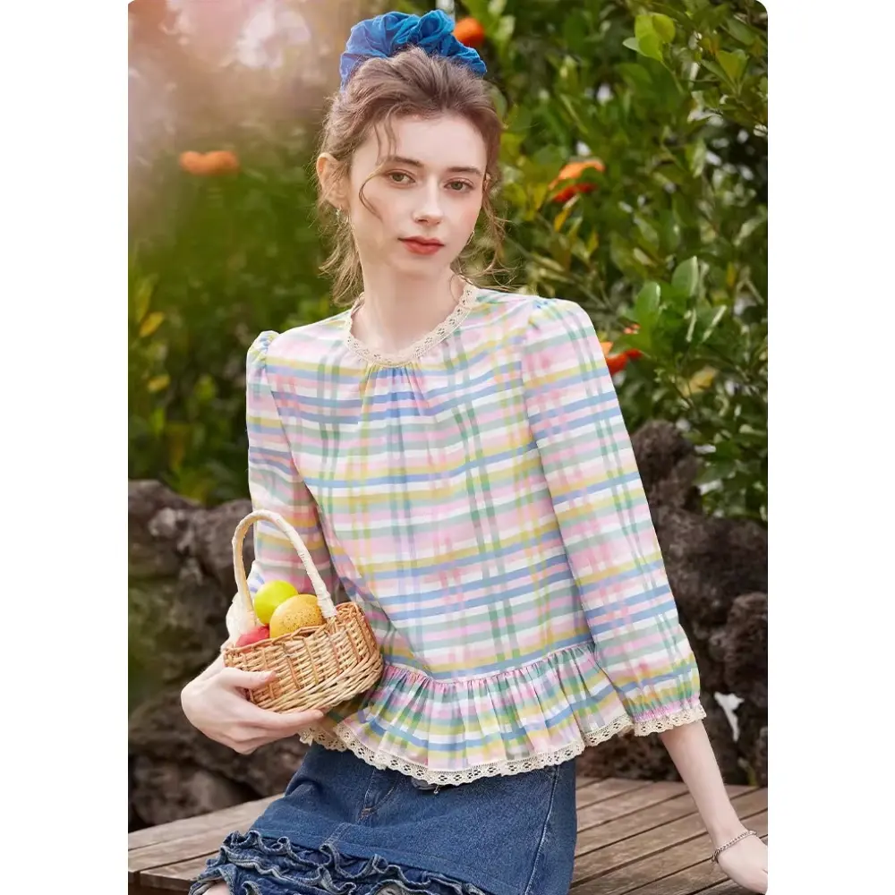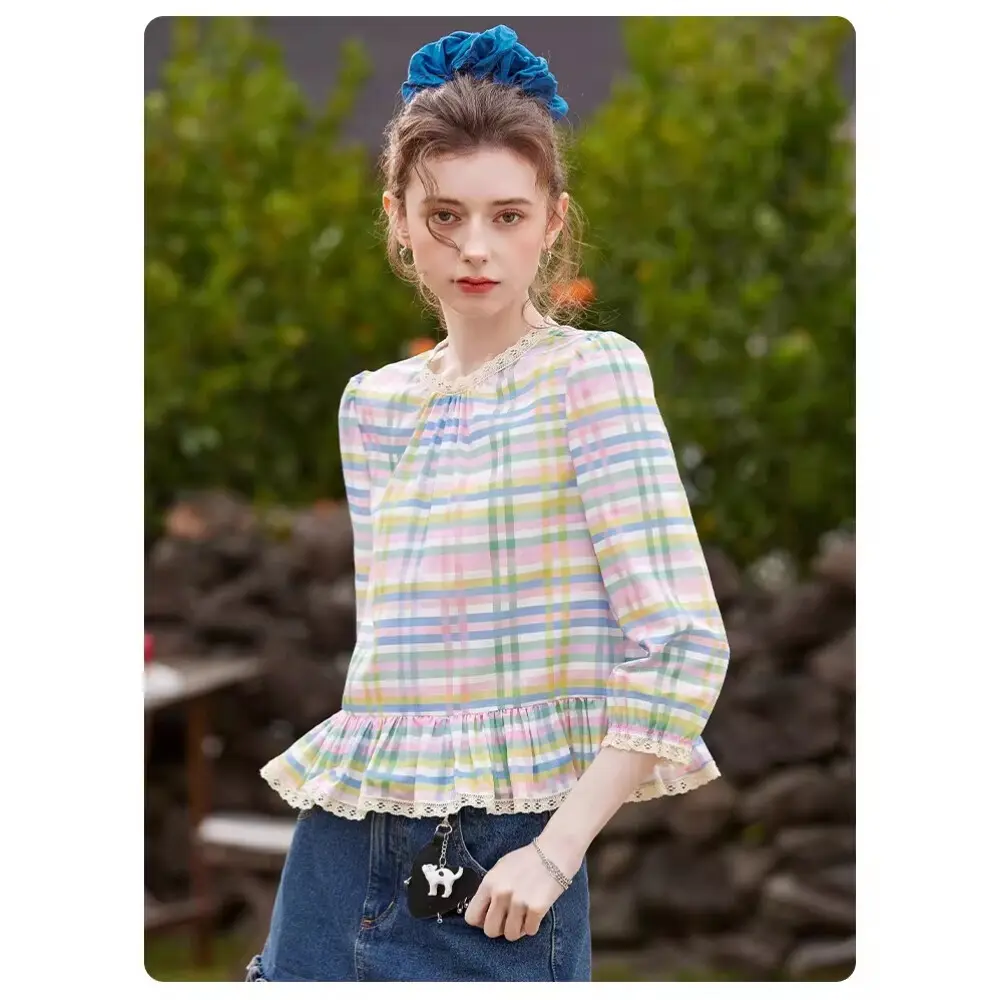 CHICMORE Atasan kemeja kotak-kotak longgar bergaya retro cantik untuk wanita