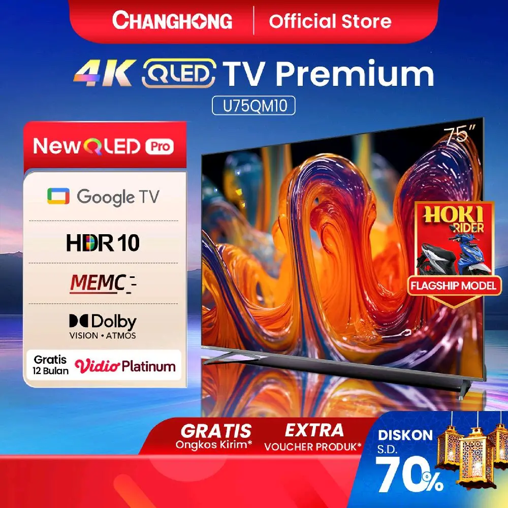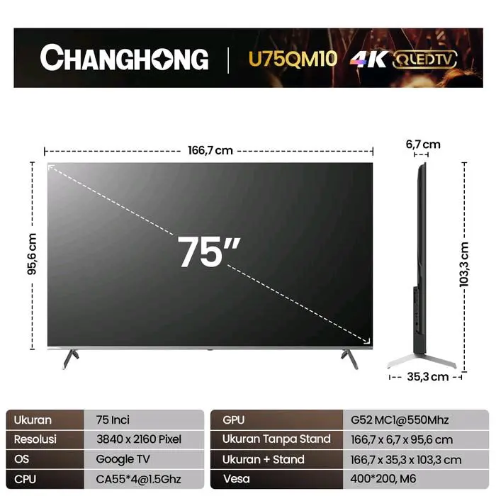 ·Model U75QM10+KAYU - TV ini memiliki model U75QM10+KAYU, memberikan desain yang modern dan elegan. Tambahkan ke rumah Anda untuk penampilan yang istimewa. 🏠