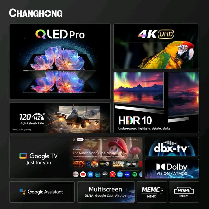 ·Dolby Audio dan DBX-TV - TV ini menawarkan kualitas suara yang luar biasa dengan Dolby Audio dan DBX-TV. Nikmati setiap momen dengan suara yang jernih dan mendalam. 🎧