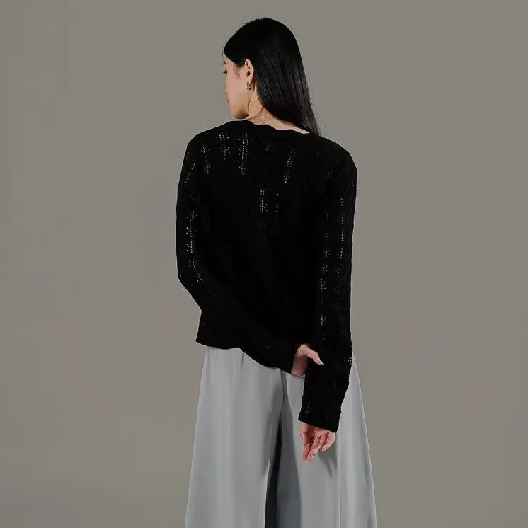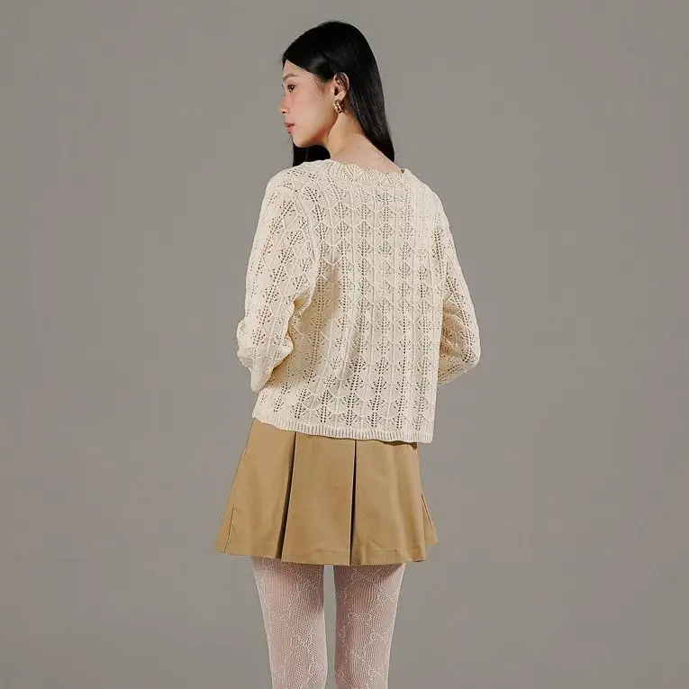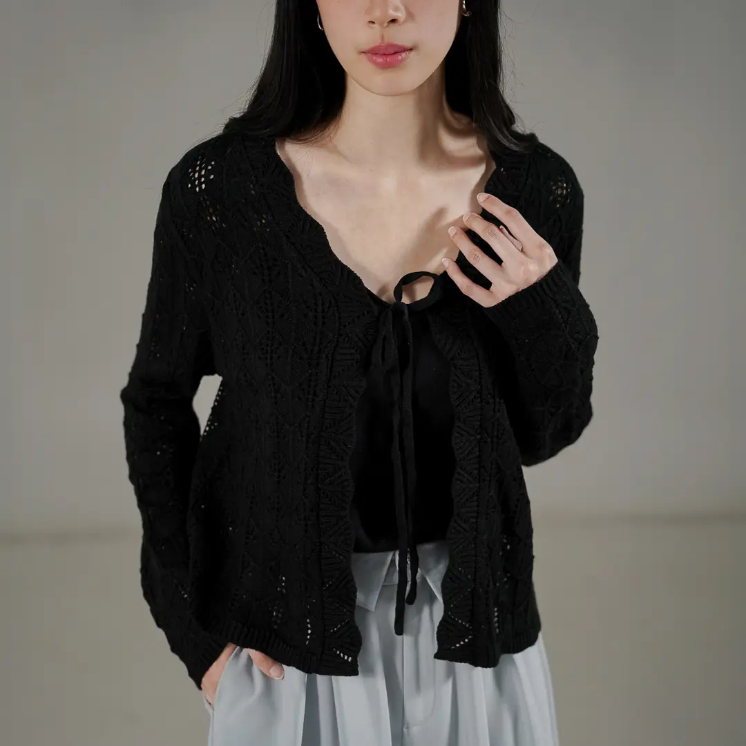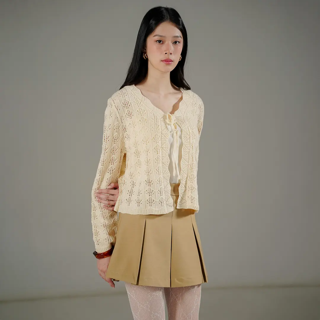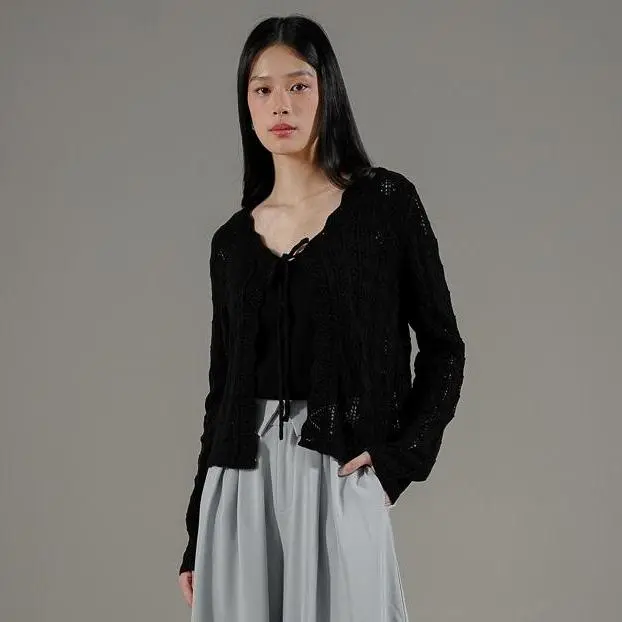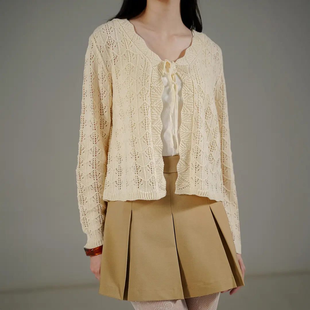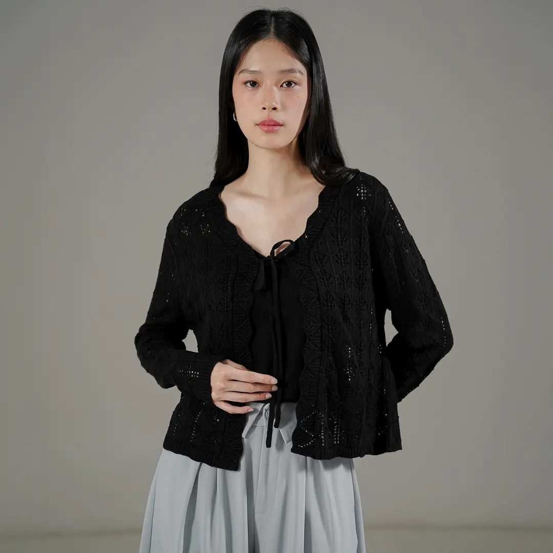 Outer rajut tekstur berongga (open-work knit) yang ringan dan sejuk saat dikenakan. Dilengkapi dengan tali hidup di bagian depan yang memudahkan Anda untuk menyesuaikan gaya. Daya tarik utamanya ada pada detail pinggiran bergelombang (scalloped edge) yang mengalir cantik dari area leher hingga ke ujung depan, memberikan sentuhan manis, feminin, dan stylish.