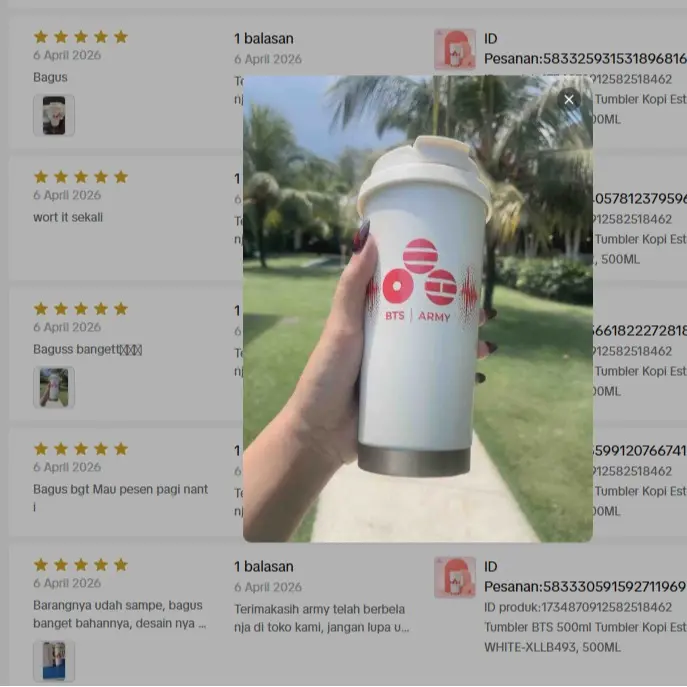 Setiap tumbler akan kami periksa satu per satu sebelum dikirim, untuk memastikan tidak bocor, tidak mengelupas, dan tidak berubah bentuk.