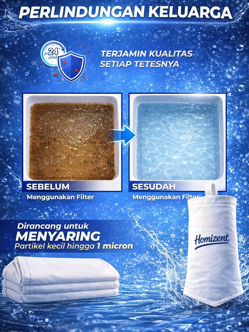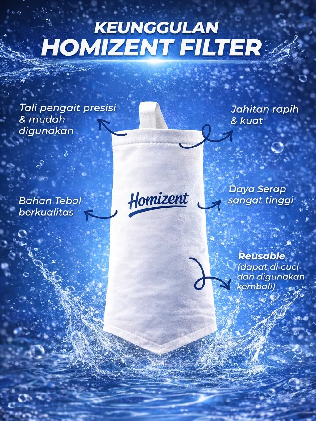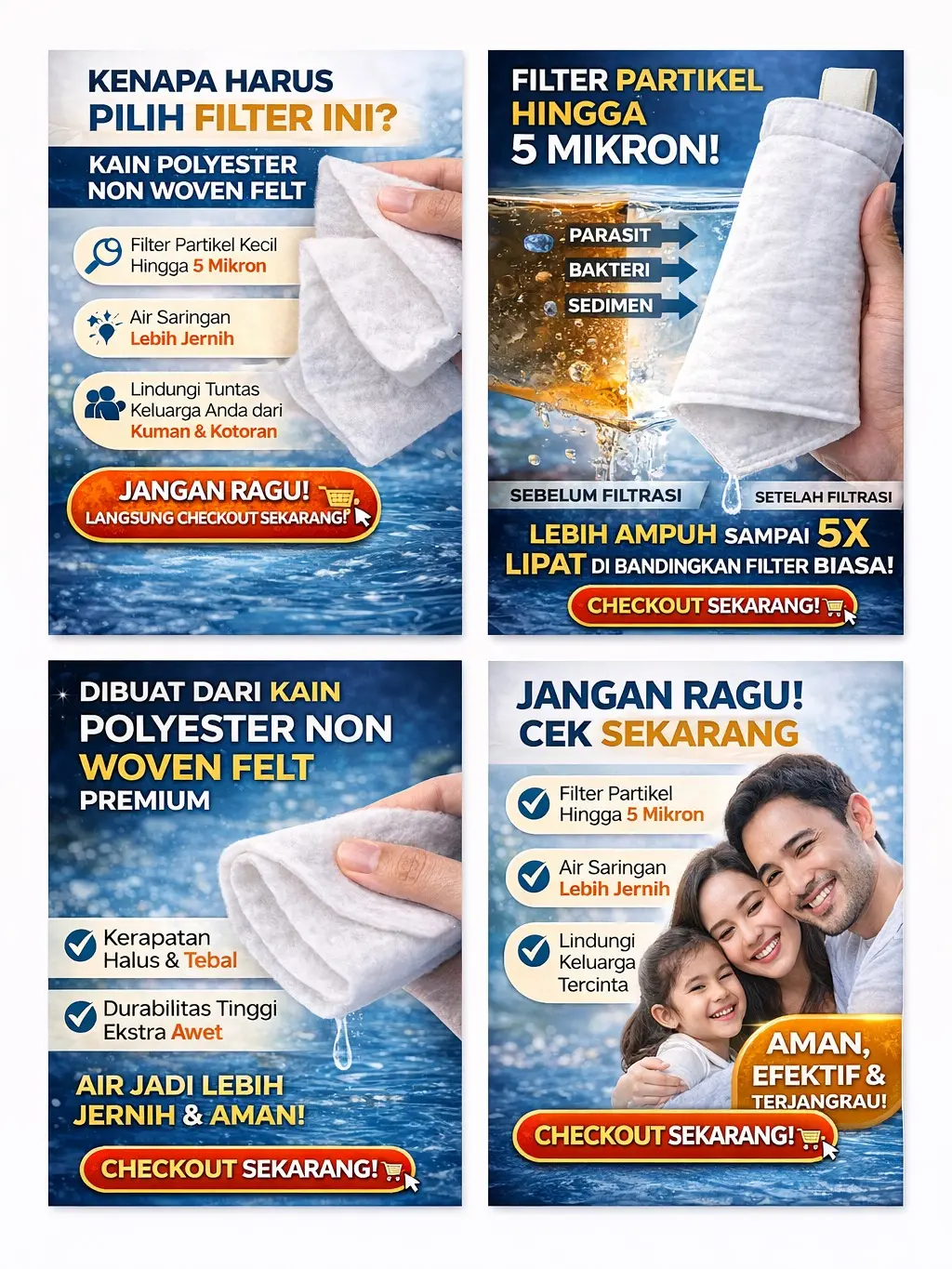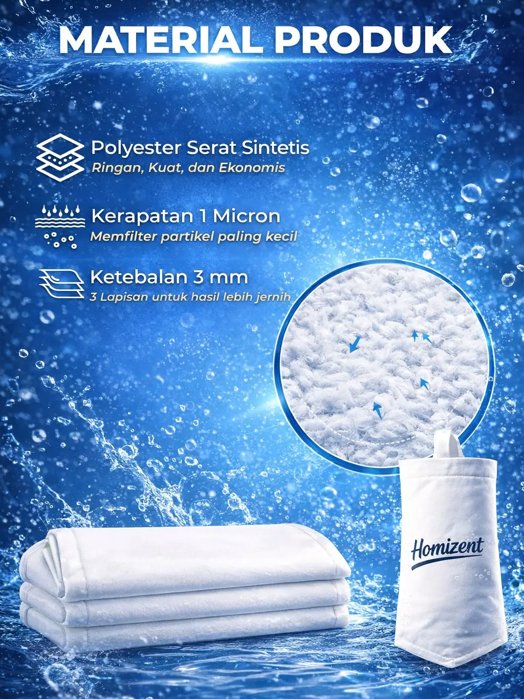 Filter ini cocok untuk berbagai jenis air seperti PDAM, Sumur Bor, WTP, dan lainnya. Tebal dan kualitas bagus, filter ini mudah digunakan. Saringan air jernih, berkarat, atau berpasir dapat disaring dengan filter ini. Bahan kain yang tebal membuatnya efektif dan dapat dicuci.