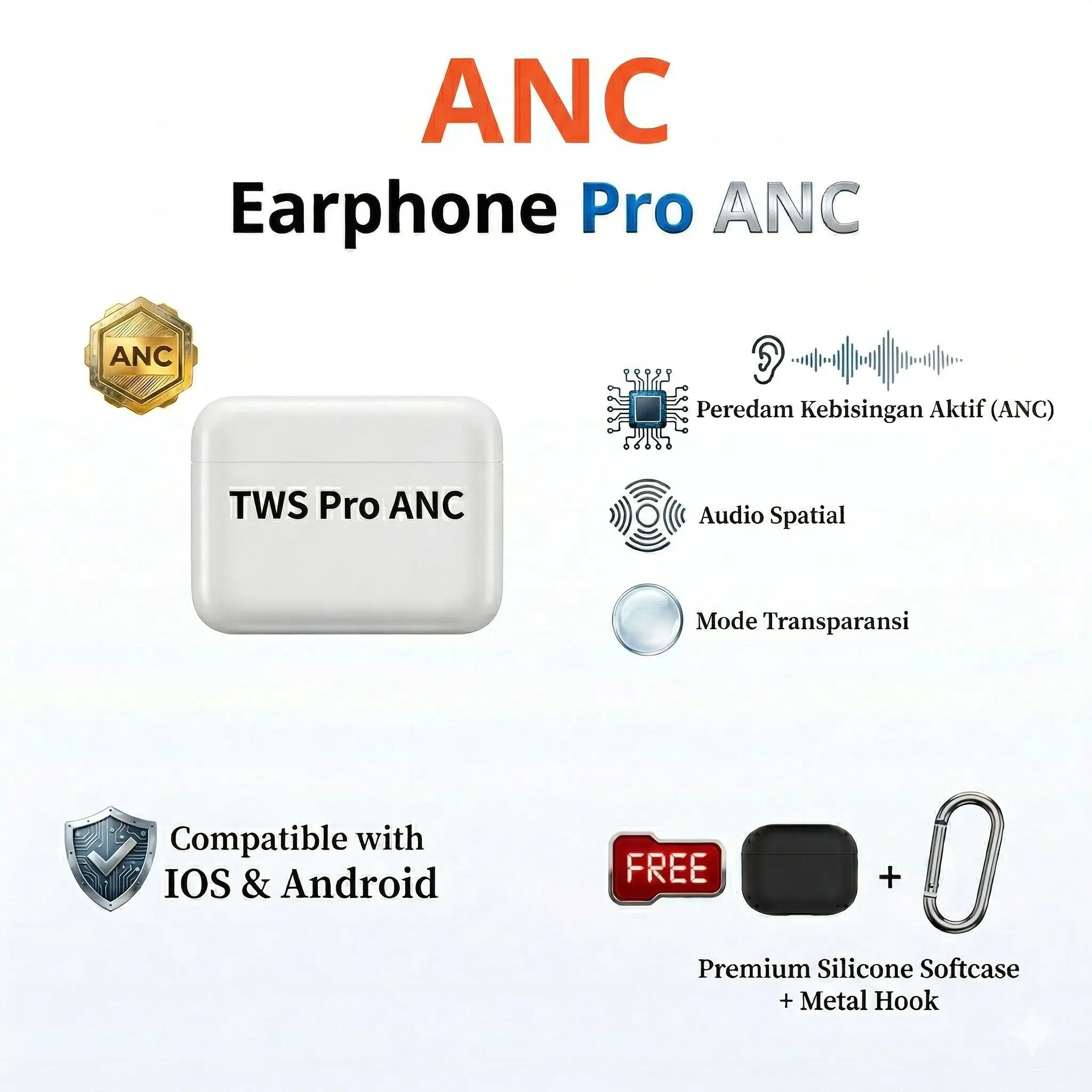 Charging Case: Mengisi daya earbuds 2-3 kali (Total standby 10+ jam), mendukung pengisian daya nirkabel (Wireless Charging).