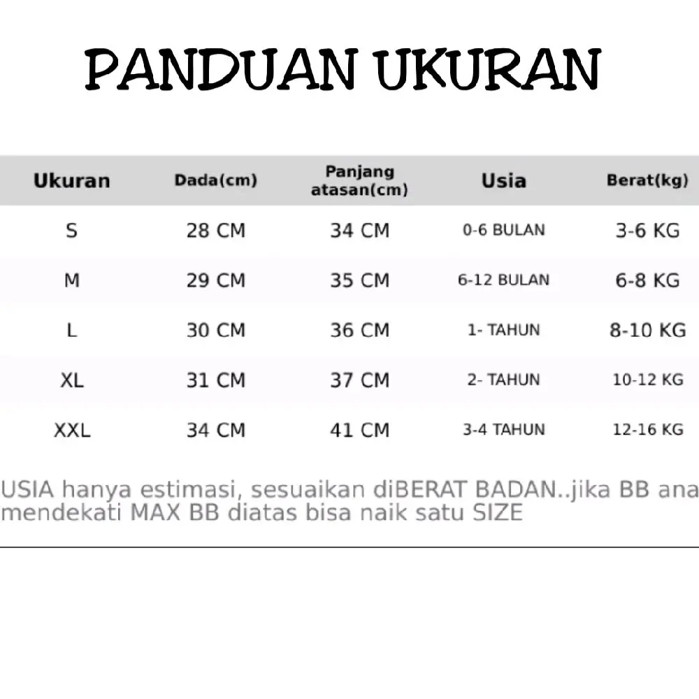 ** CATATAN : UMUR HANYA PERKIRAAN BUAT ANAK BADAN STANDAAR, LEBIH PASTINYA MOHON DIUKUR TERLEBIH DAHULU KARNA BADAN ANAK BEDA-BEDA