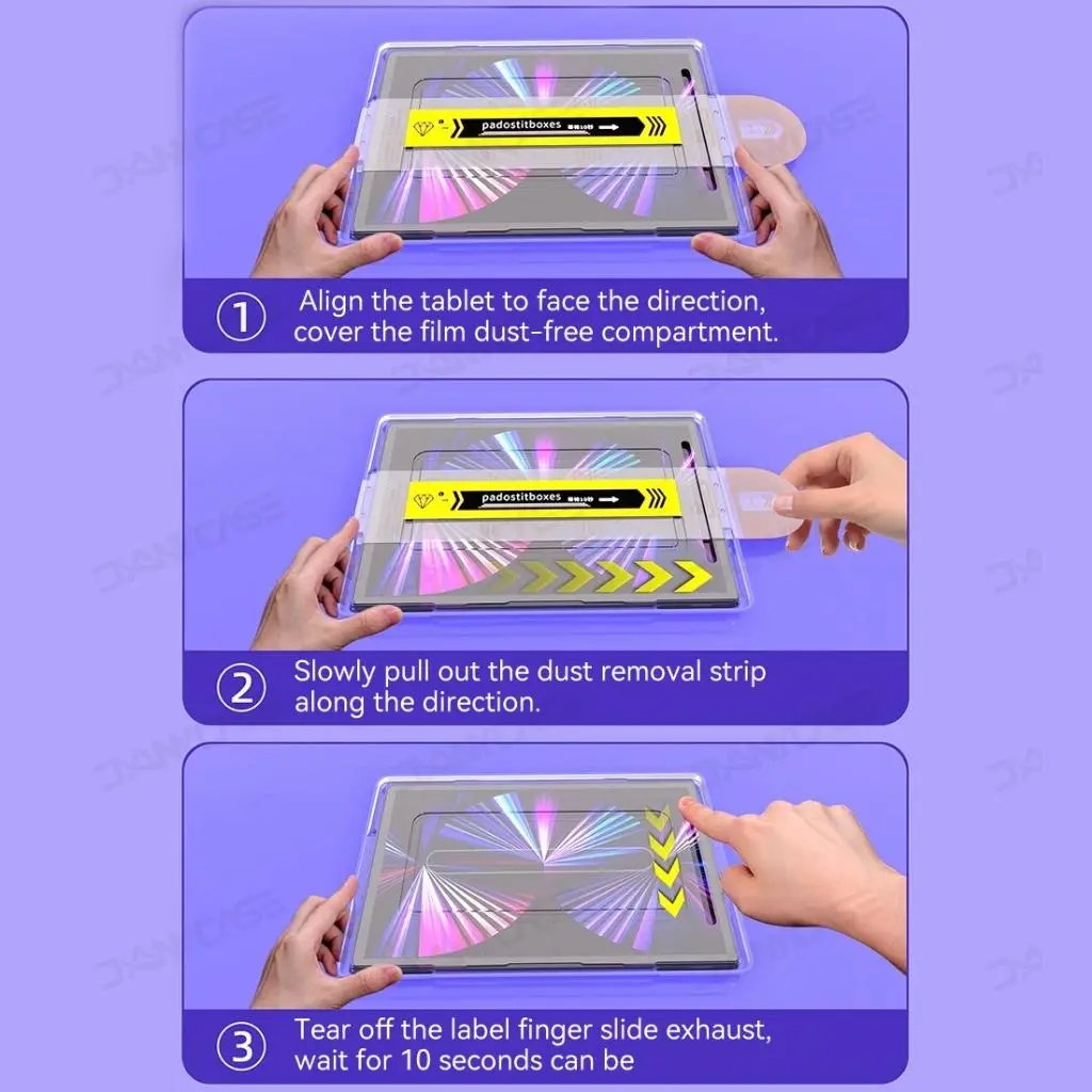 ①Align the tablet to face the direction, cover the film dust-free compartment.
