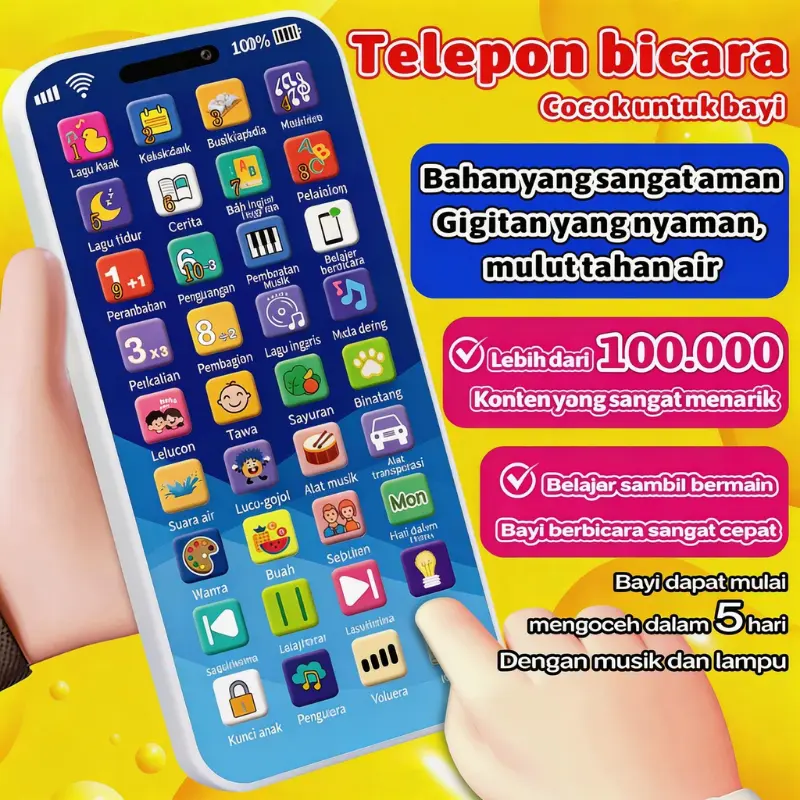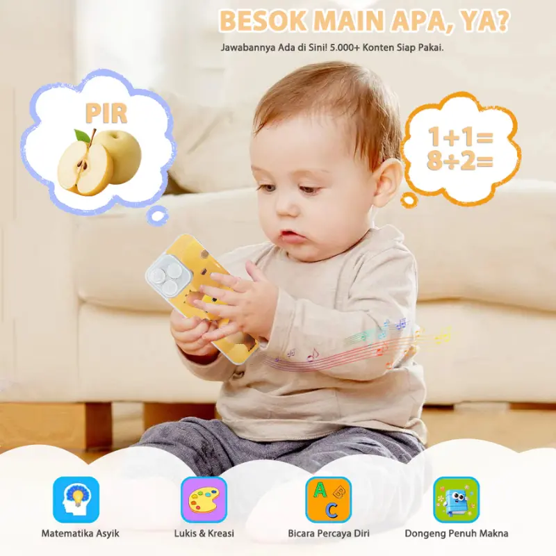 5.Fungsi Produk: Edukasi awal anak, Mainan interaktif berbentuk ponsel, Dilengkapi cahaya dan musik, Konten audio yang melimpah, Bisa bermain musik seperti piano.