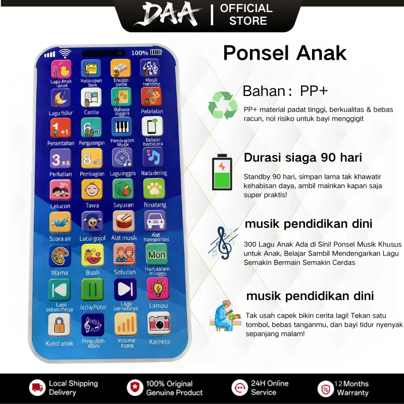 12.Keunggulan Utama Produk: 36 tombol,Konten edukasi sangat lengkap, musik dan lampu menarik perhatian anak, pengisian ulang via Type-C, praktis dan tahan lama, Dilengkapi musik enerjik, cerita pengantar tidur, dan lagu pengantar tidur
