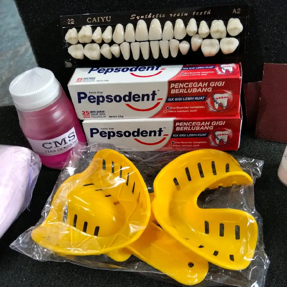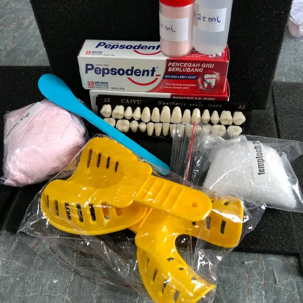 ✨ Paket temtooth berisi: - Temtooth 35gr - Lem (bubuk 25gr + liquid 25ml) - Giegie fullset isi 28 biji - Alginate 45gr - Alat cetak rahang - Sendok pengaduk