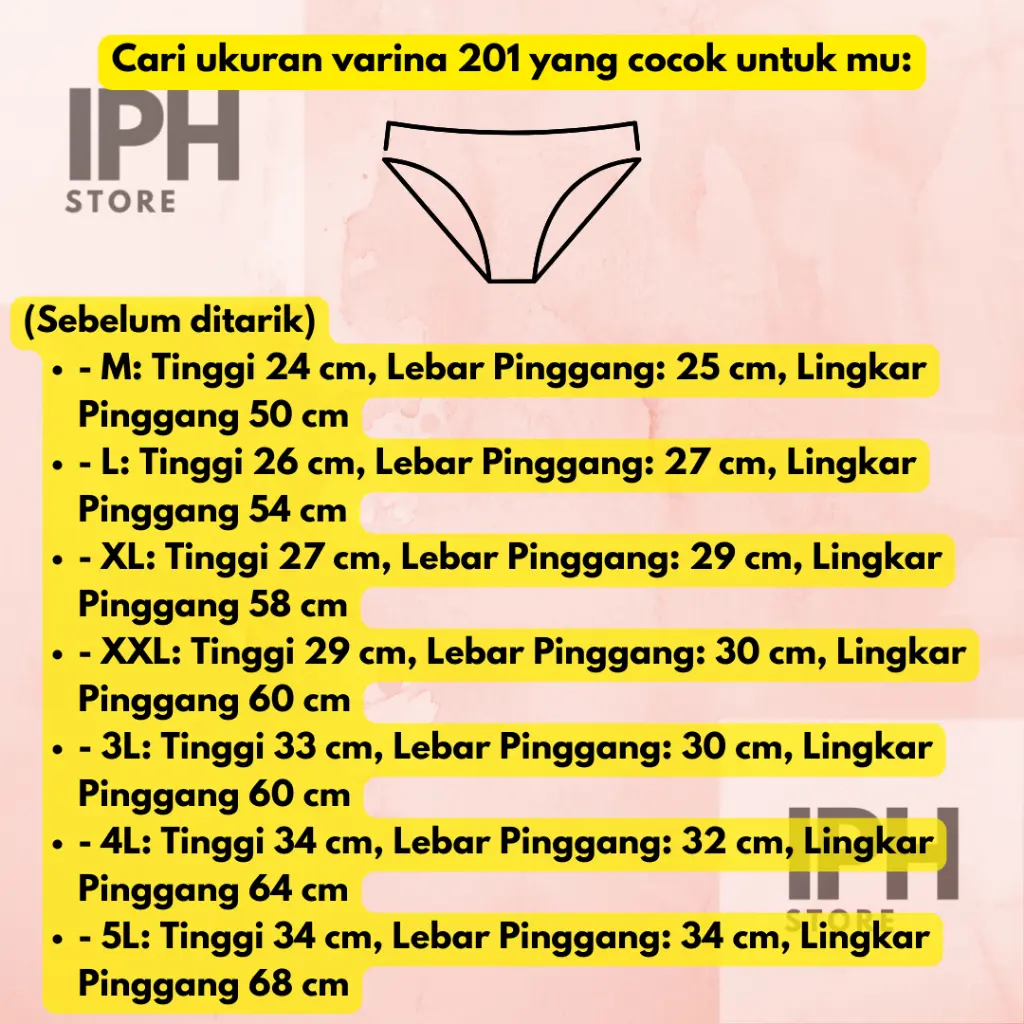 - 3L: Tinggi 33 cm, Lebar Pinggang: 30 cm, Lingkar Pinggang 60 cm