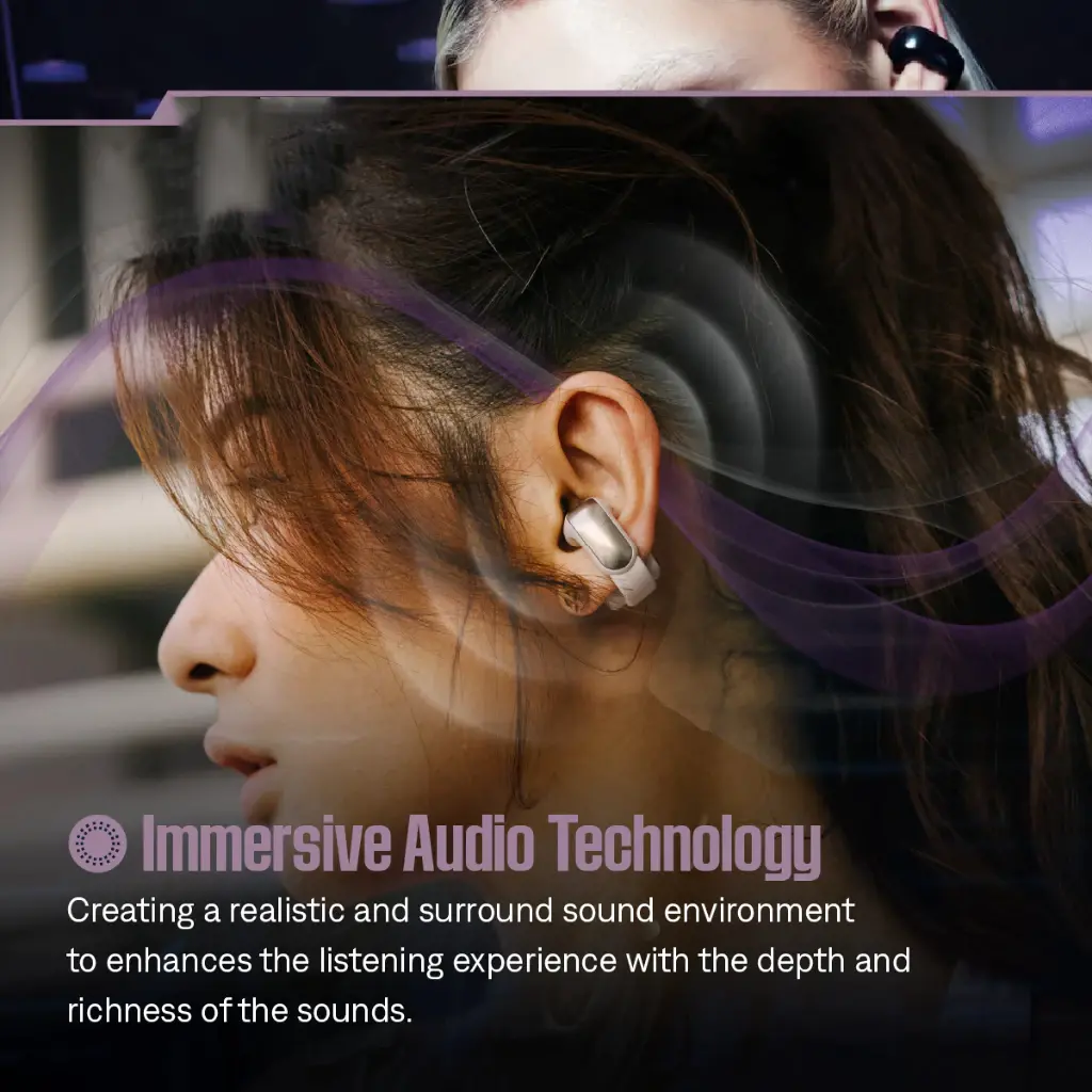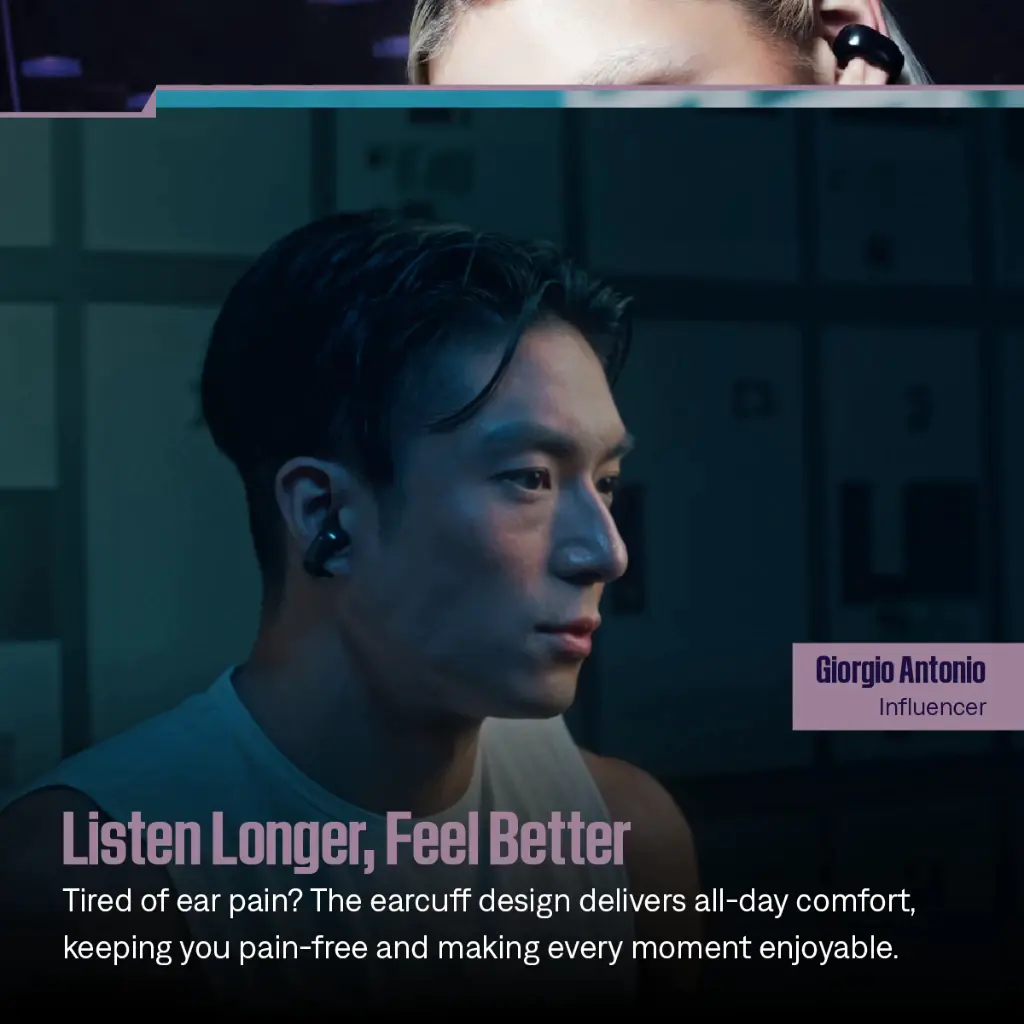 Desain ‘Flex Band’ yang lembut dan elastis nyaman dipakai sepanjang hari, seolah tidak pakai apa-apa di telinga.
