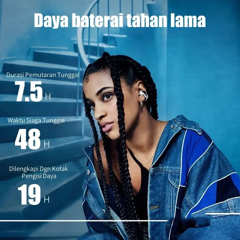 Baterai tahan hingga 7,5 jam, dan charging case yang bisa mengisi ulang sampai 2,5x. Desain nyaman untuk pemakaian lama.