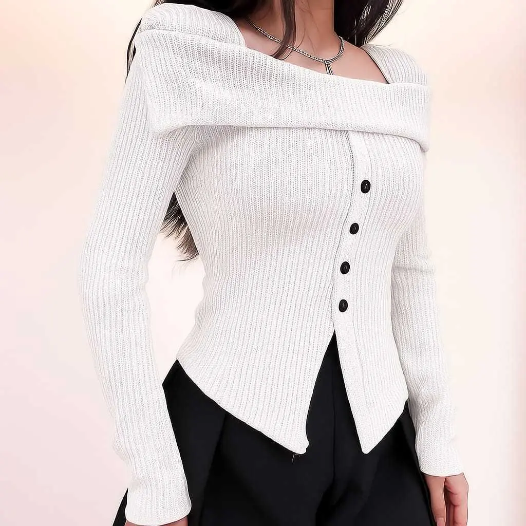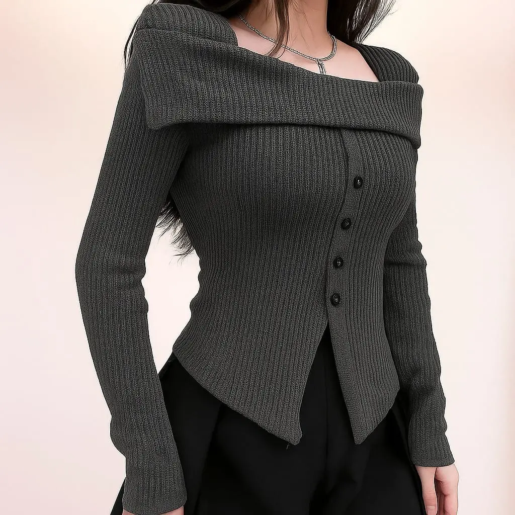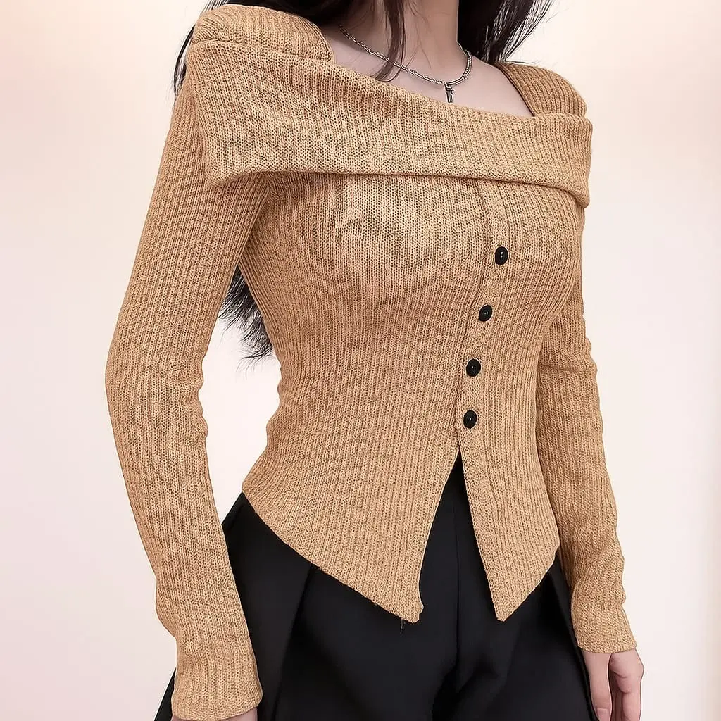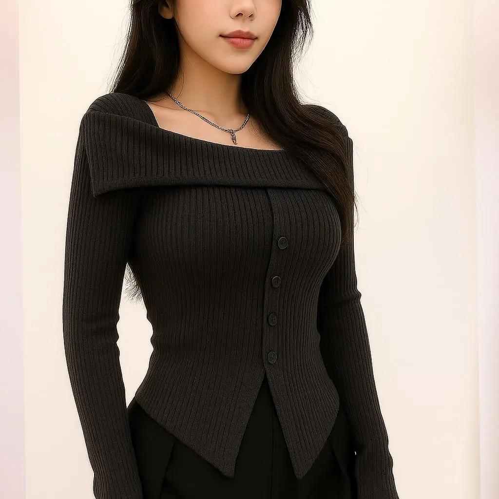 5. Sabrina Top Kancing Elegan Atasan Polos Knite Rib Panjang