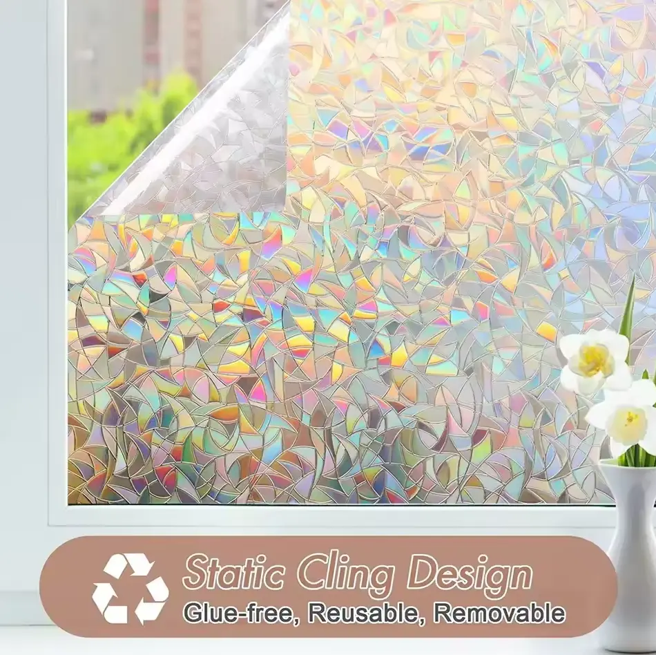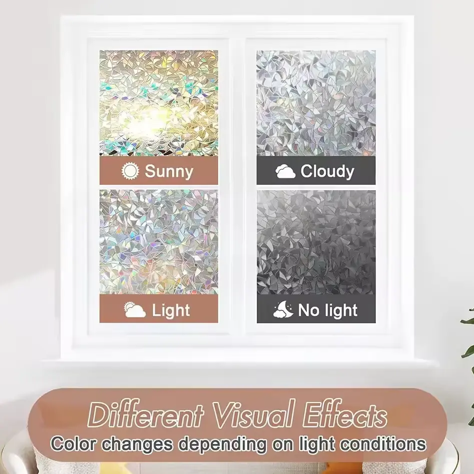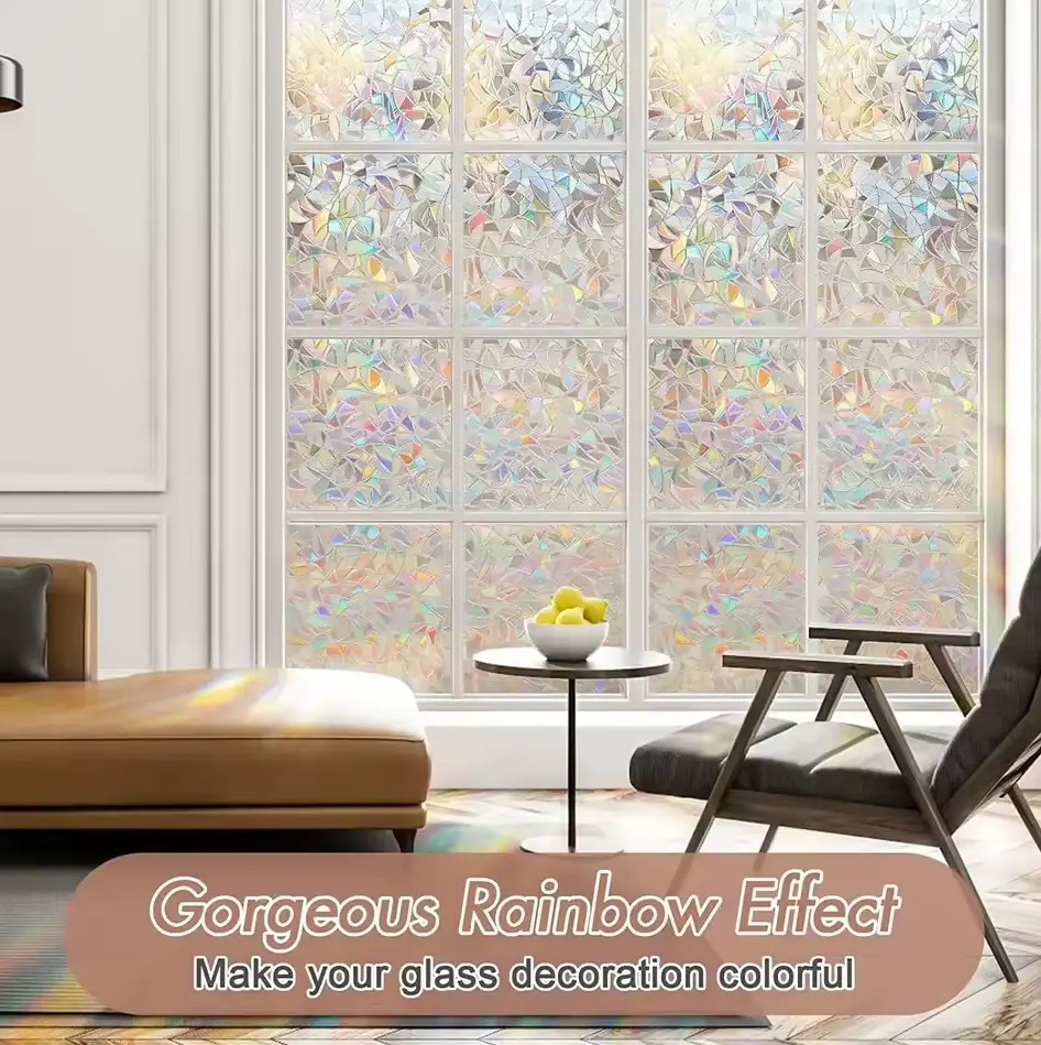 Didesain dengan pola 3D yang menawan, window film ini mampu menciptakan efek pelangi yang indah saat cahaya matahari mengenainya. Pantulan warna-warni yang dihasilkan akan menyebar ke seluruh ruangan, menciptakan suasana hangat dan estetis. Cocok digunakan di ruang tamu, kamar tidur, ruang kerja, bahkan kamar mandi untuk mempercantik tampilan interior Anda.