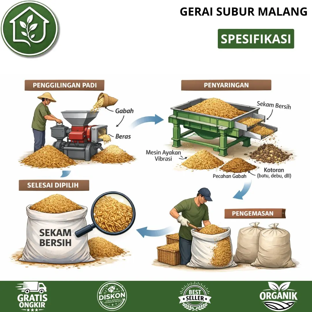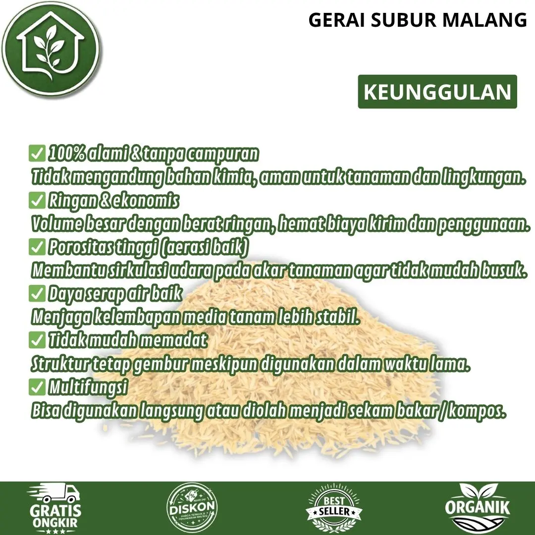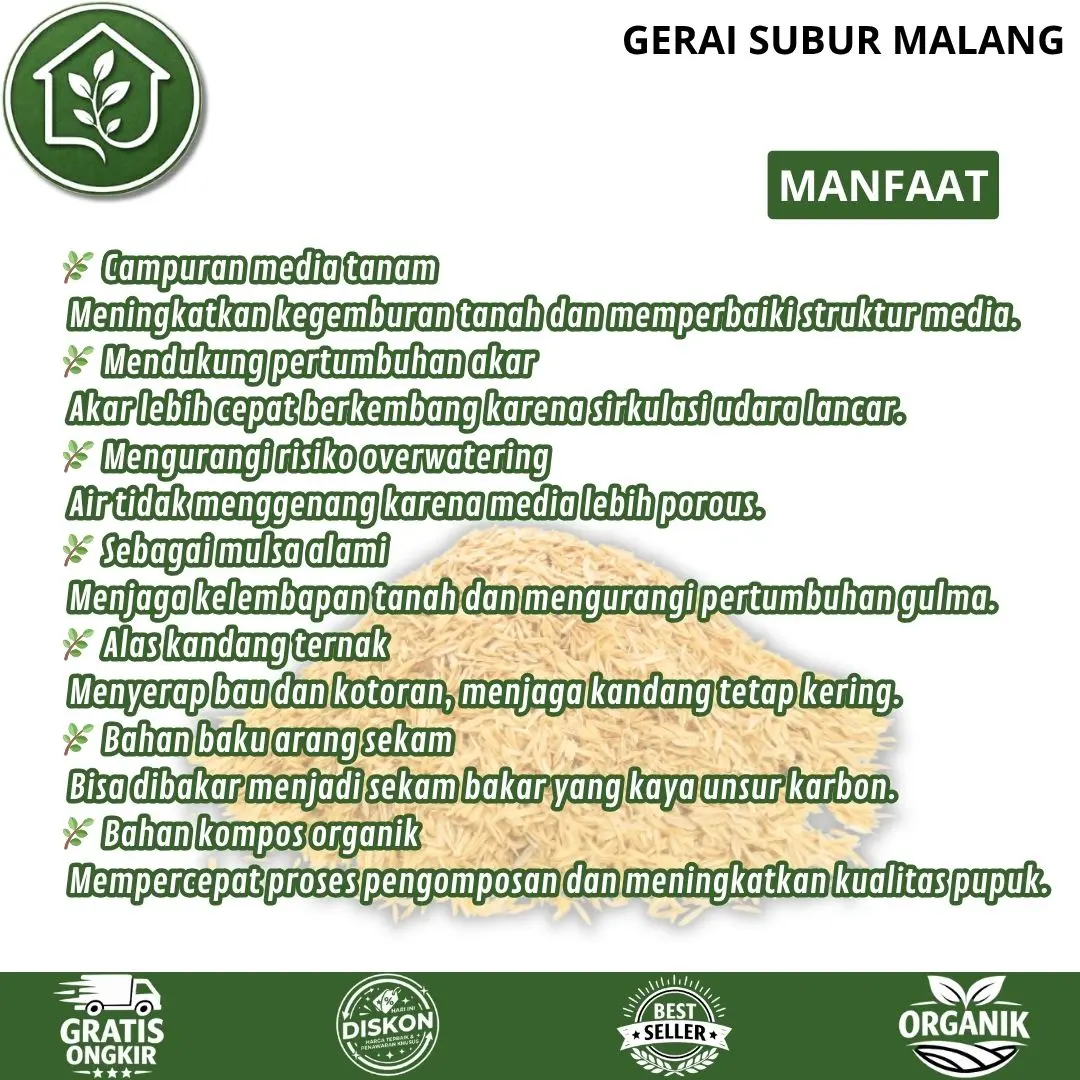- Sekam padi pilihan kualitas terbaik untuk campuran media tanam agar lebih gembur, poros, dan sehat untuk pertumbuhan akar.