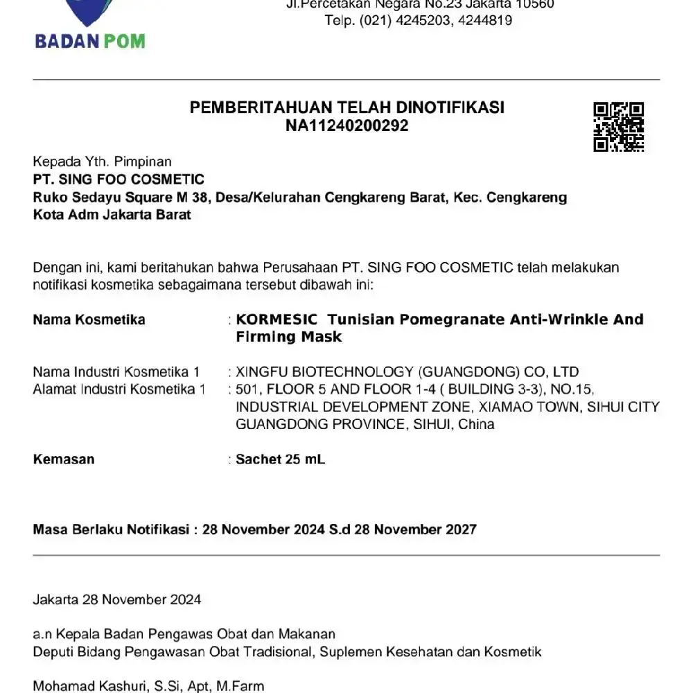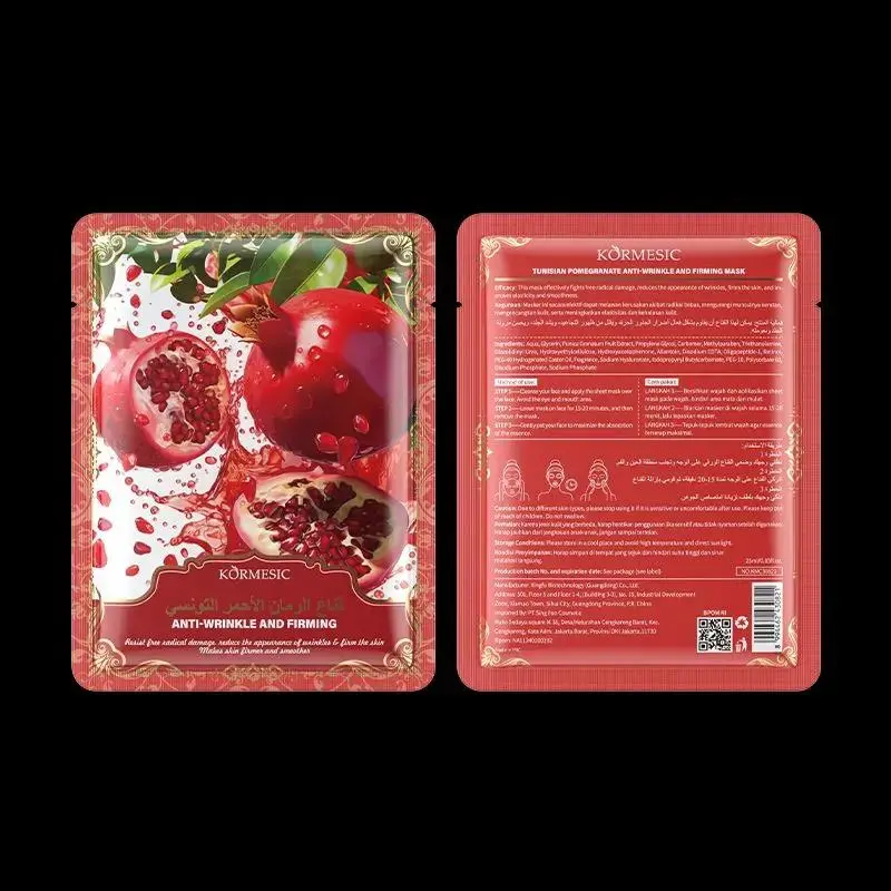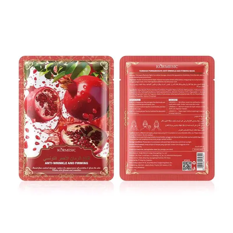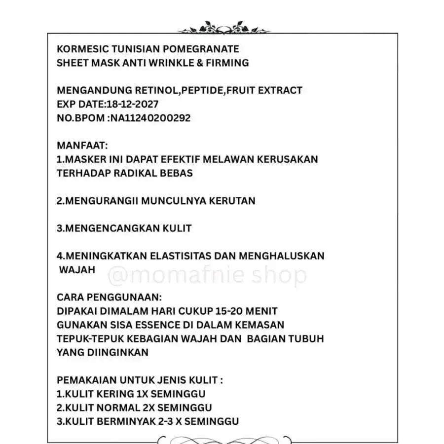 Kormesic tunisia pomegranate Sheet mask anti wrinkle & firming 25ml Mengandung retinol,peptide,fruit extract Exp date:18-12-2027 Manfaat:  1.masker ini dapat efektif melawan kerusakan terhadap radikal bebas 2.mengurangii munculnya kerutan 3.mengencangkan kulit 4.meningkatkan elastisitas dan menghaluskan kulit Cara penggunaan: 1.kulit kering 1 x seminggu 2.kulit normal 2 x seminggu 3.kulit berminyak 2 - 3 x seminggu penggunaan dimalam hari 1.bersihkan wajah dan aplikasikan sheet mask ke wajah hindari area mata dan mulut 2.biarkan masker diwajah selama 15-20 menit lalu lepaskan. 3.anda dapat menggunakan sisa essence didalam kemasan,lalu ditepuk-tepuk lembut ke wajah agar terserap maksimal.