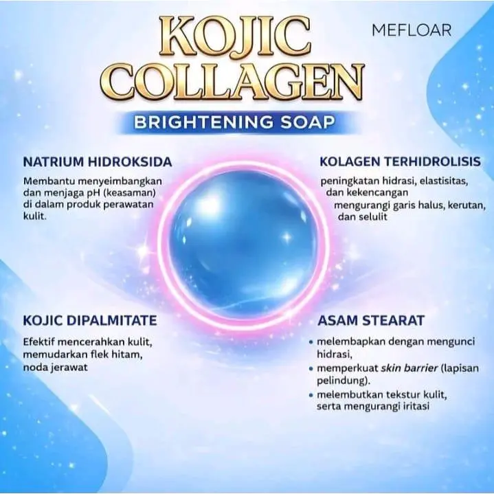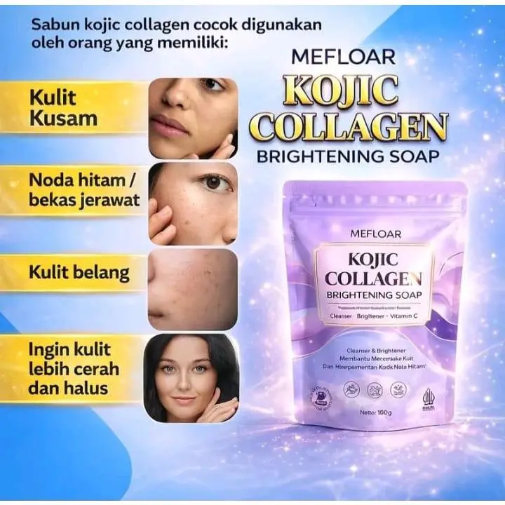 Kojic colagen brightening soap dapat membantu mencerahkan dan merataan warna kulit, membersihkan secara lembut tanpa membua kulit kering. dan juga menjaga kelembaban membuat kulit terasa halus