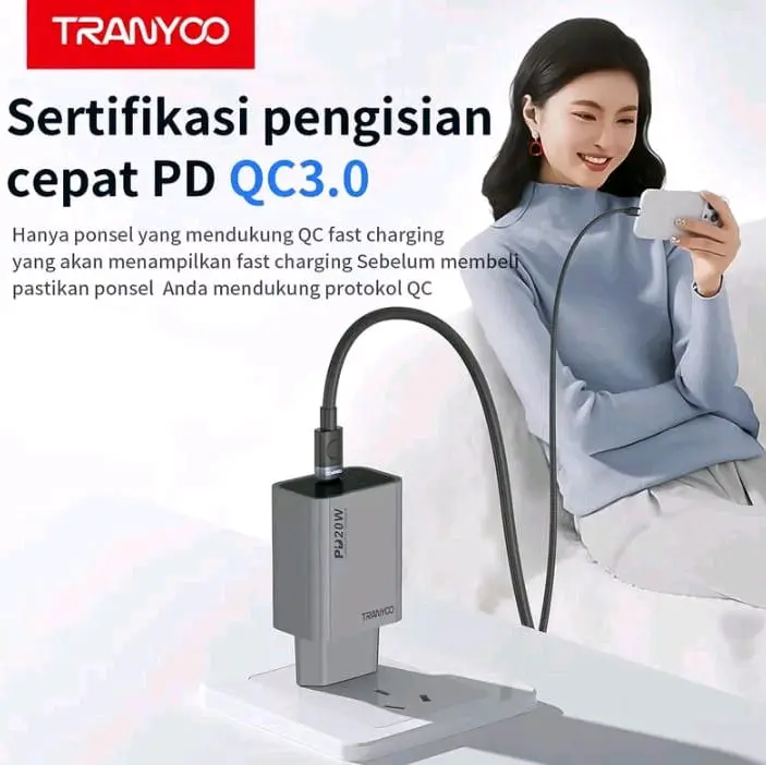 TRANYOO EU7 PD20W adalah adaptor daya yang dilengkapi kabel cepat 1 meter. Cocok untuk pengisian daya ponsel Android dan perangkat Apple. Dengan tipe kabel Type-C ke Type-C atau Type-C ke Lightning, adaptor ini menawarkan transmisi berkecepatan tinggi. Ideal untuk pengguna Samsung, Xiaomi, Redmi, POCO, vivo, dan OPPO.