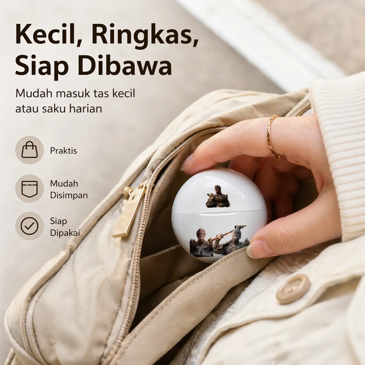Earbud TWS edisi khusus Wukong dengan desain minimalis mewah dan elegan. Ukuran kecil ringkas, mudah dibawa ke mana saja. Nyaman dipakai seharian, tidak sakit telinga dan tidak mudah lepas.