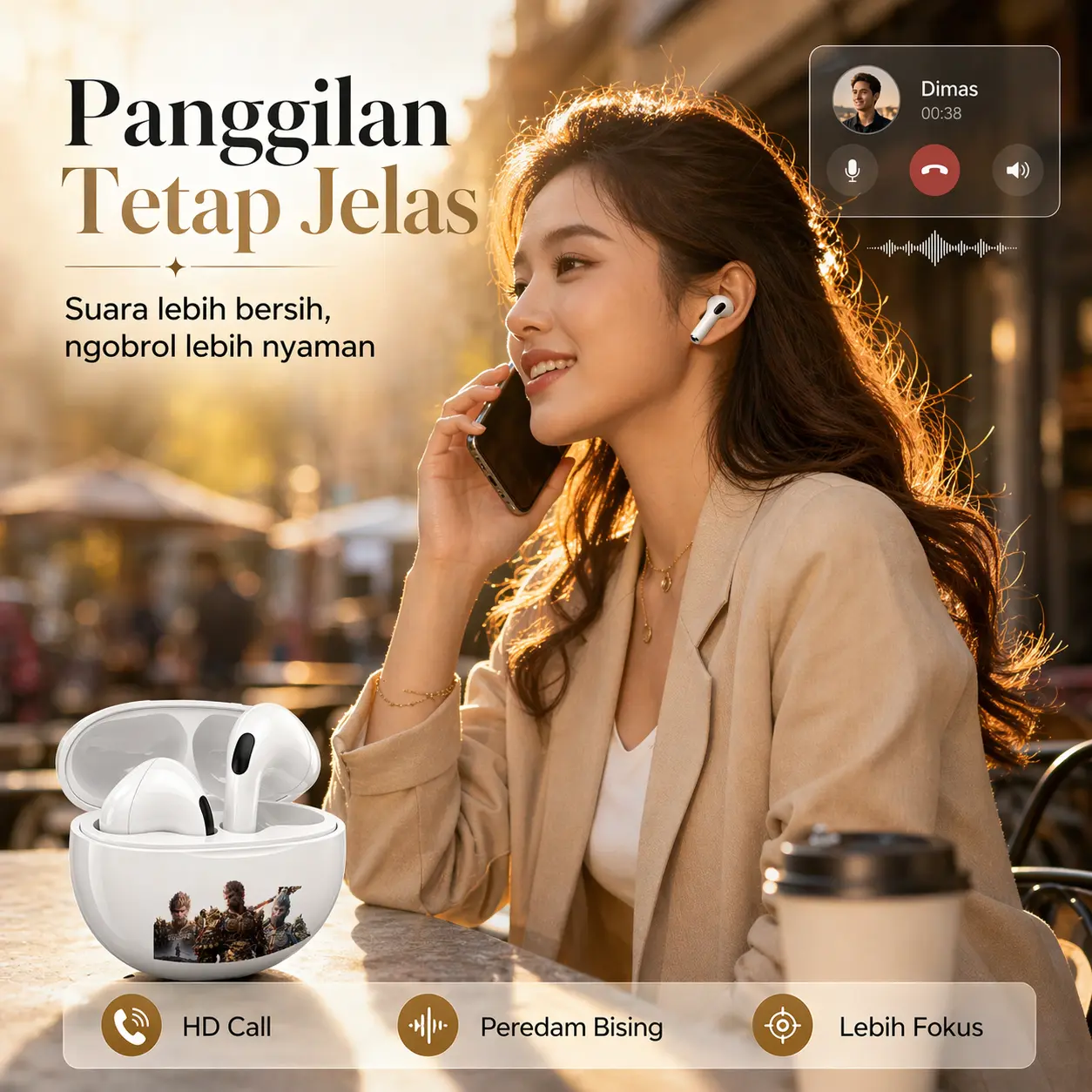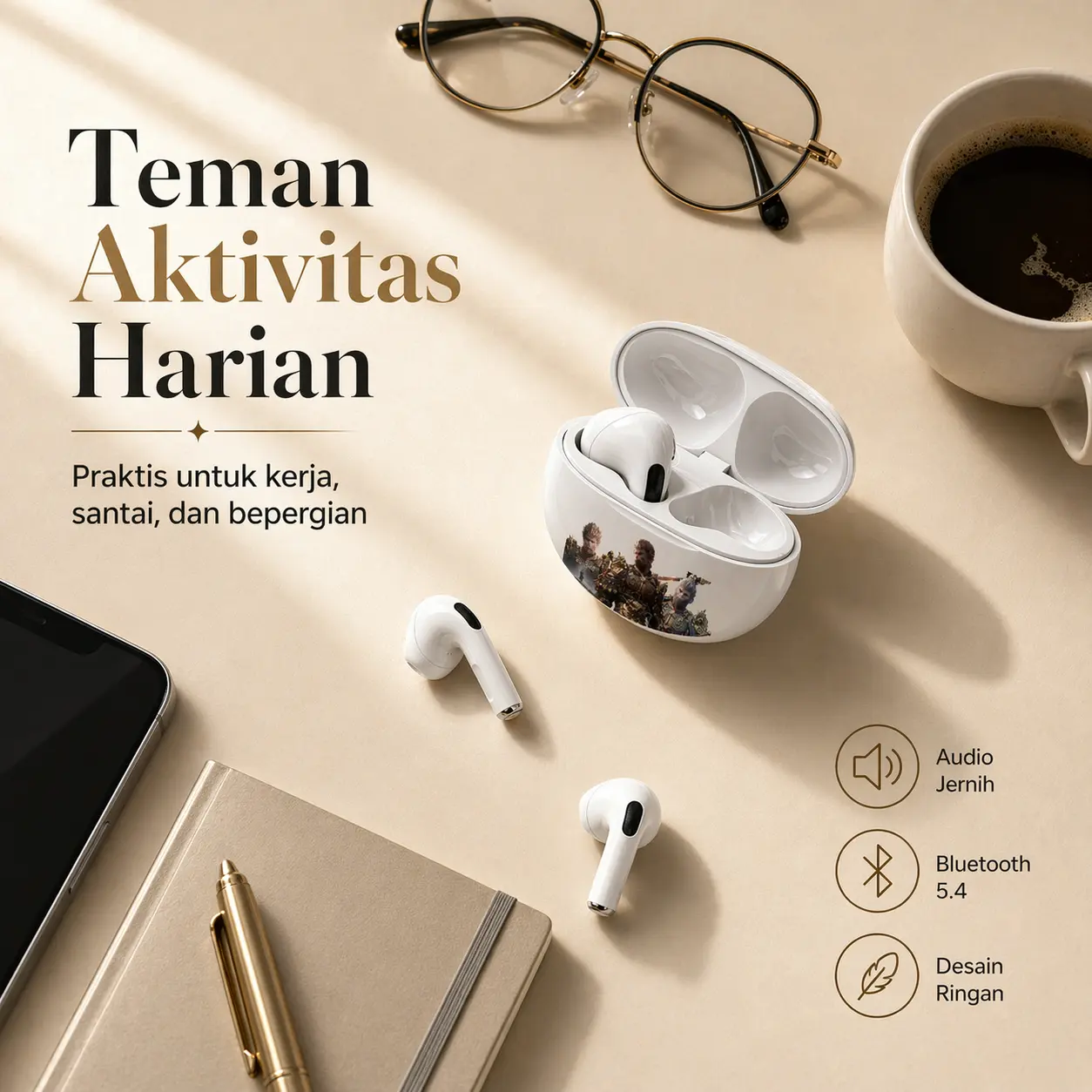 Dilengkapi Bluetooth 5.4 koneksi super stabil, tanpa delay untuk main game dan nonton video. Anti air IPX5 aman untuk olahraga, fitur noise reduction dan panggilan jernih.