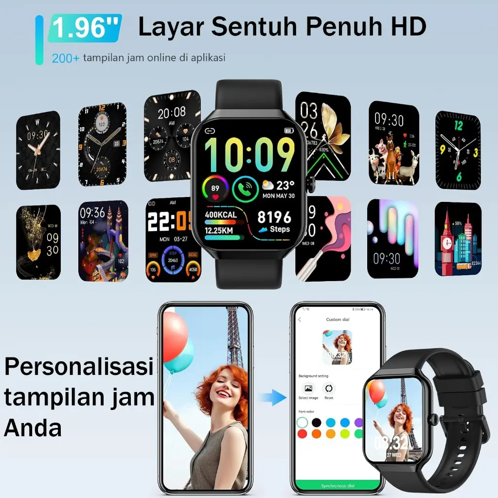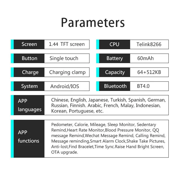 * Fitur lainnya: Temukan gelang, pengingat alarm, kamera jarak jauh, lampu angkat, cahaya, kontrol musik, cuaca