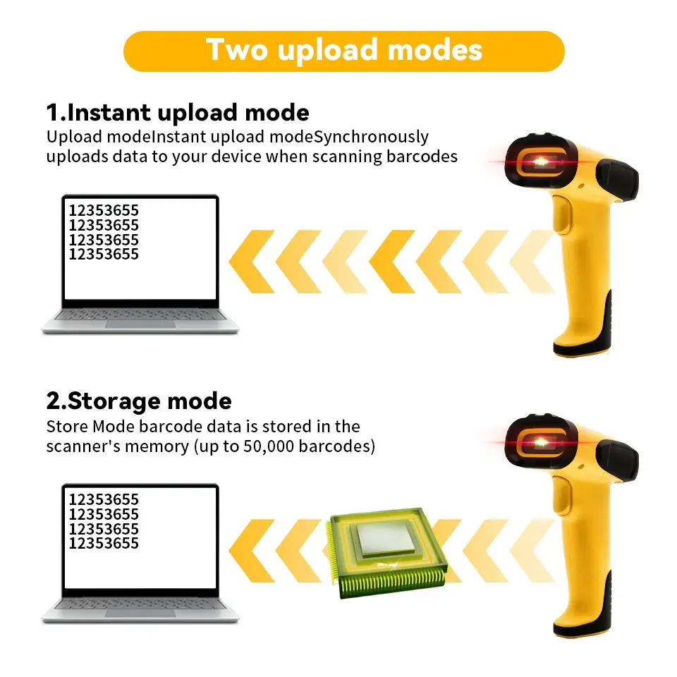 - 2 Mode Upload Data: Instant Upload (langsung masuk ke device) & Storage Mode (simpan internal hingga ±50.000 barcode).
