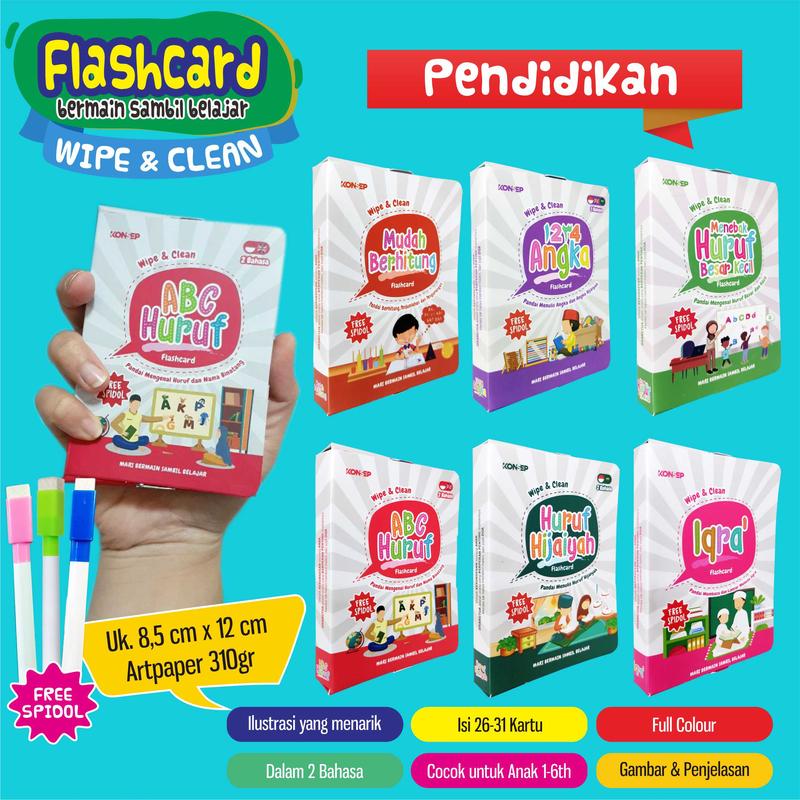BAHAN KERTAS TEBAL: ART PAPER 310 LAMINASI GLOSSY BOLAK BALIK (TEBAL DAN TIDAK MUDAH SOBEK) SIZE KARTU: 8.5 x 12 cm FREE SPIDOL 1.MUDAH BERHITUNG 2. ANGKA 3. HURUF BESAR HURUF KECIL 4. ABC HURUF 5. HURUF HIJAIYAH 6. IQRA' - ILUSTRASI MENARIK - ISI 26-31 KARTU - FULL COLOUR - 2 BAHASA - COCOK UNTUK ANAK 1-6 TAHUN - GAMBAR BESERTA PENJELASAN #MAINAN #MAINANANAK #MAINANBAYI #KARTUBAYI